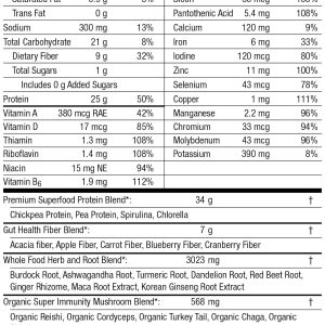 - Delivers 25g protein with balanced, whole food macros and prebiotic fiber
