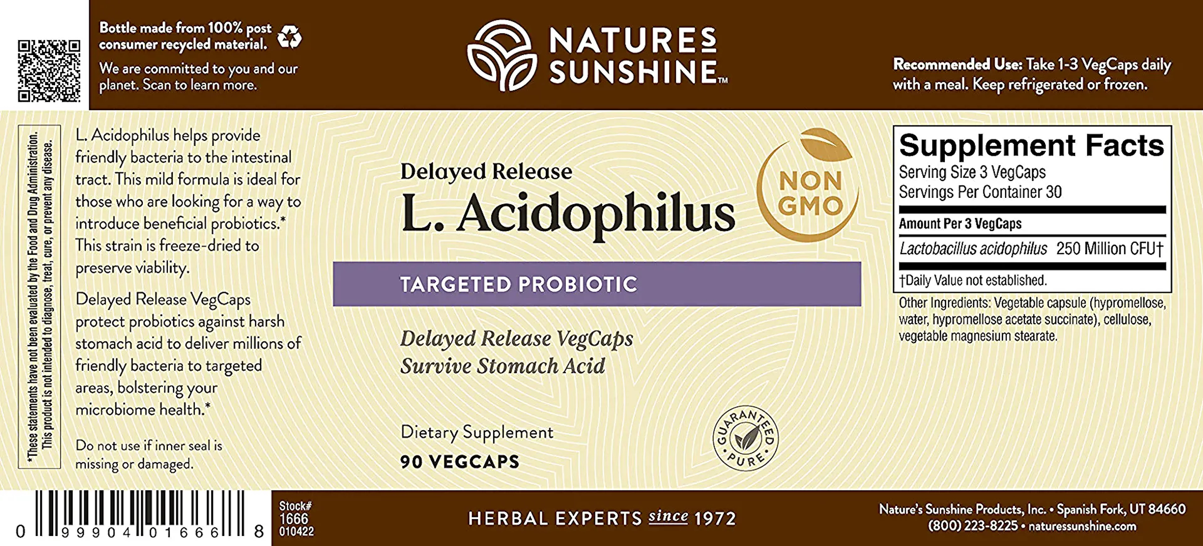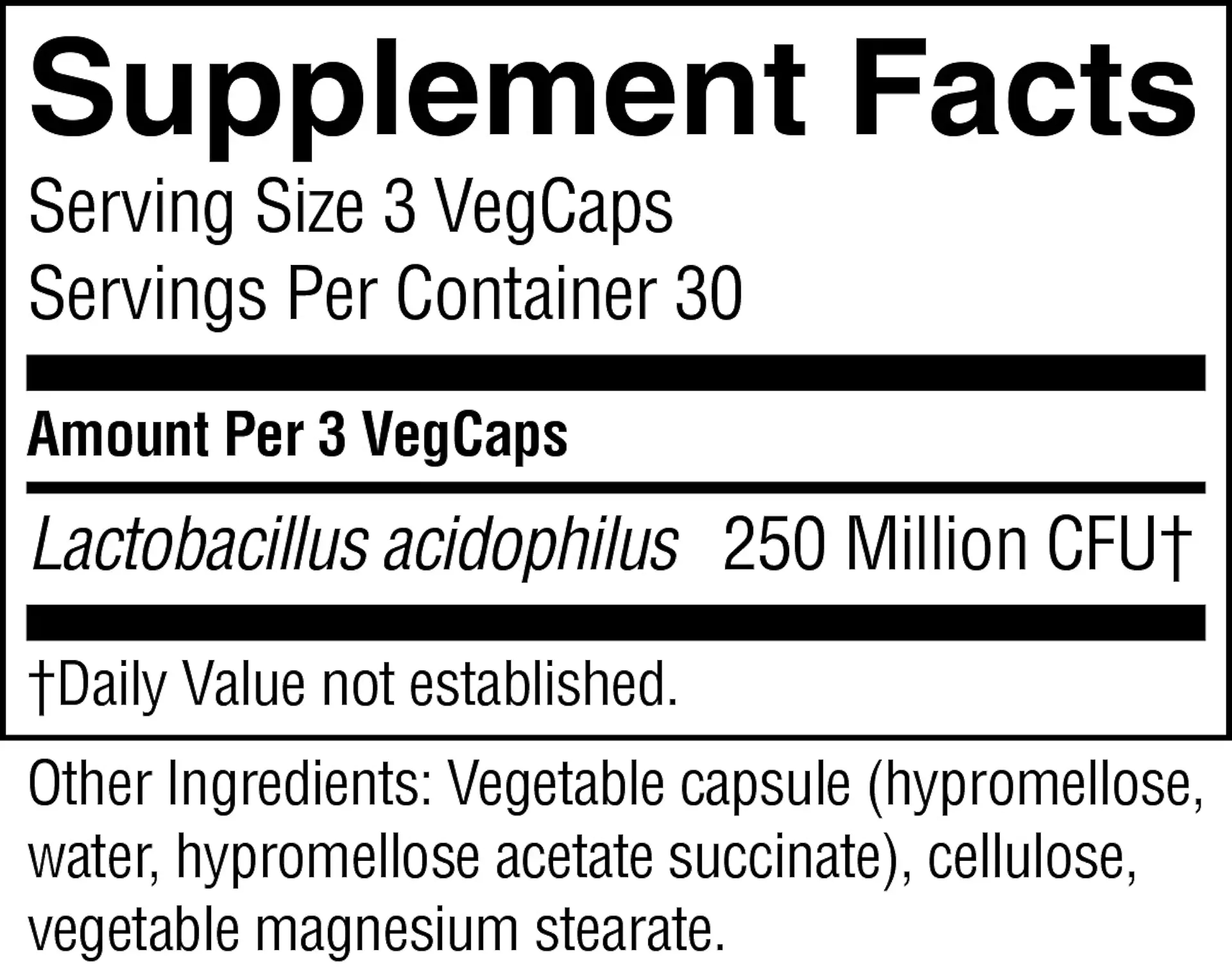 Friendly bacteria help keep in check other microbes in the body. Unfortunately, all strains of helpful bacteria are often destroyed by antibiotics. But supplementation can reintroduce them, helping to create an optimal balance. Acidophilus is a strain of Lactobacillus, a symbiotic, homo-fermentative, lactic acid producing microorganism—a popular, friendly strain. This mild formula is ideal for those who desire a way to introduce beneficial probiotics to the body. Each capsule contains a minimum of 100 million organisms, freeze-dried to maintain viability. Probiotics are well absorbed in the diet and can be taken between meals to maximize absorption. Best if stored in a freezer or refrigerator.