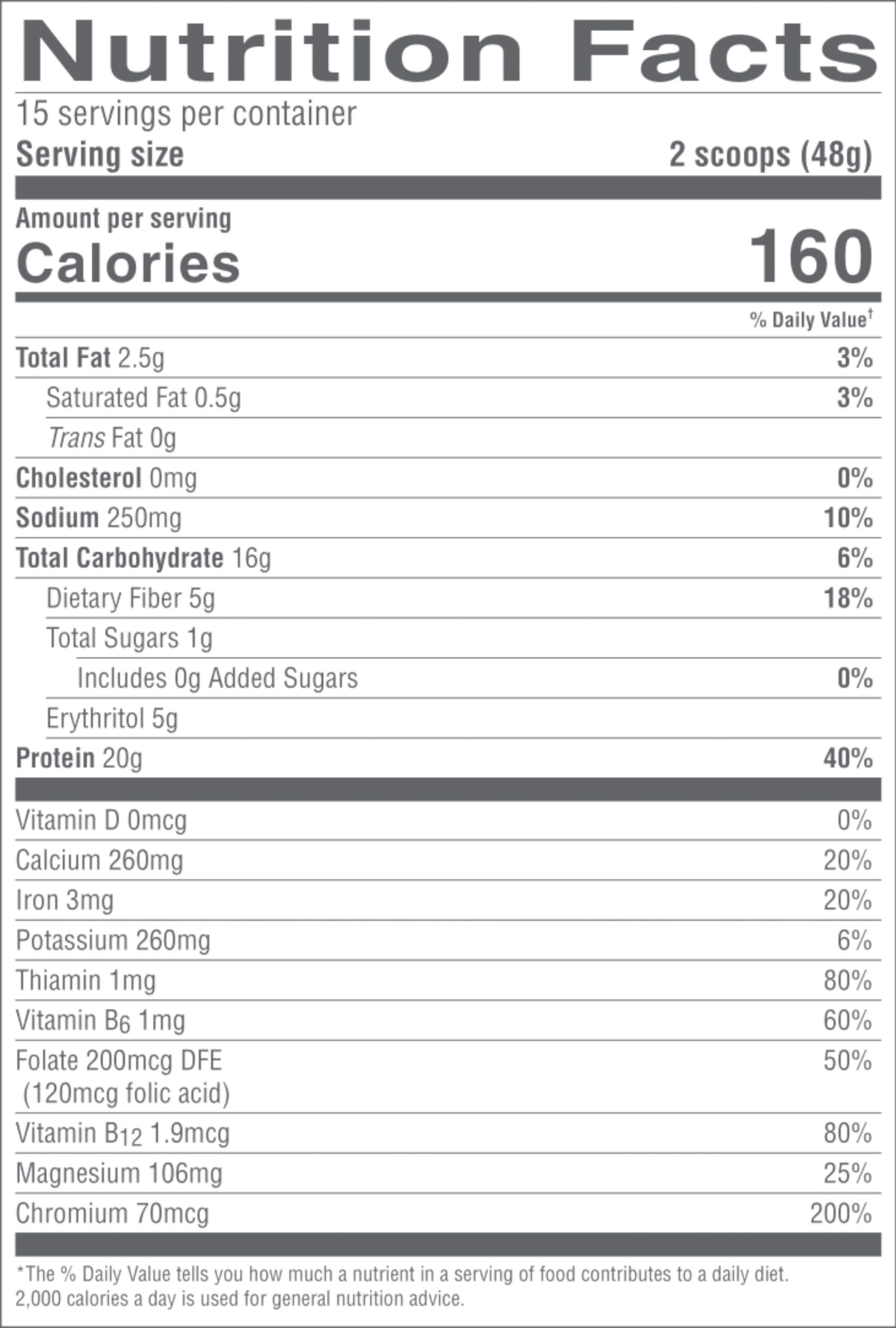 Chickpea Protein, Brown Rice Protein, Erythritol (sugar alcohol), Sunflower Creamer, Natural flavors, Calcium AAC (amino acid chelate), Gum Blend (guar gum, gum acacia, xanthan gum), Magnesium AAC (amino acid chelate), Redmond Salt, HerbaTORTM Herbal mTOR Activator, Stevia Leaf Extract, Herbal AMPK Activator, Monk Fruit, Folic Acid, Vitamin B6, Thiamin, Chromium Picolinate, Vitamin B12