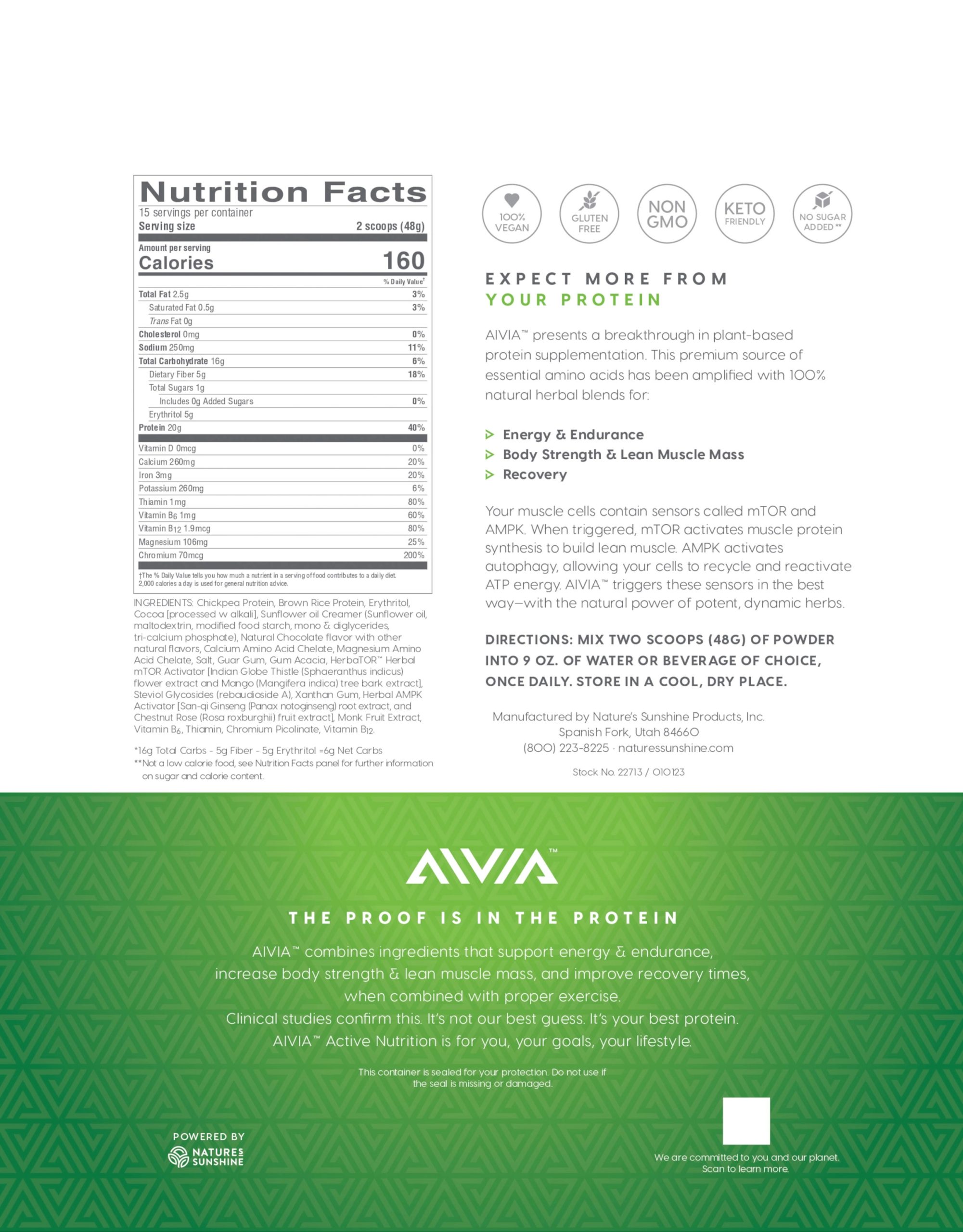No more basic powders. AIVIA presents a performance breakthrough in protein supplementation. This clean source of essential aminos is amplified with 100 natural herbal blends, which have been clinically shown to promote mTOR and AMPK up-regulation.BENEFITSFeatures two clinically studied proprietary herbal blends that trigger mTOR and AMPK for