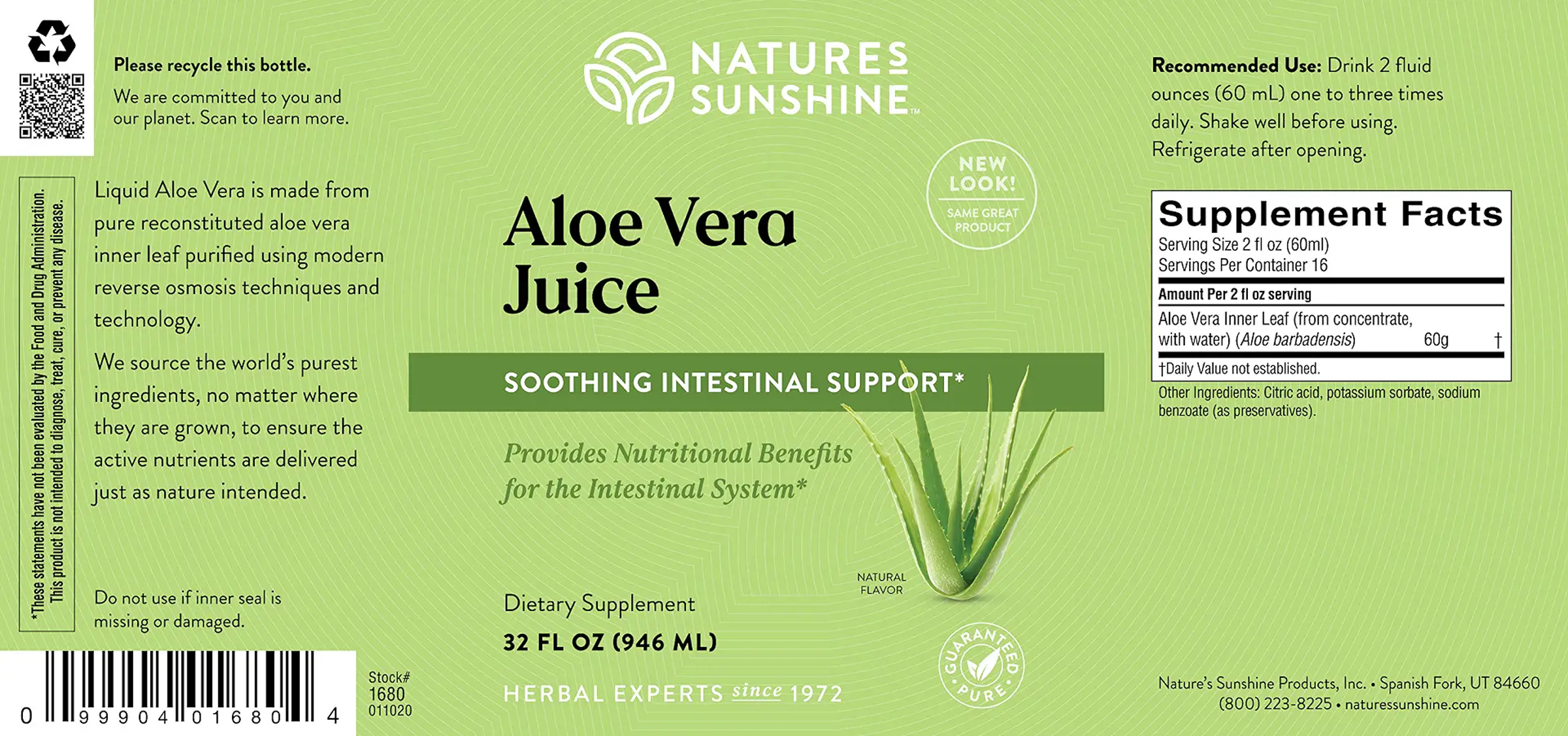 Aloe vera is a nutritional storehouse. It also contains salicylate and prostaglandins. Aloe nutritionally benefits the intestinal system and is widely used for its ability to soothe when taken internally. Many companies manufacture aloe vera, but most products on the market have lost much of the plant’s original benefits due to over-processing. Beware of aloe vera juice that claims to have no disagreeable taste. Removing this taste can leave you with a product that is only 10–15 percent aloe vera at best. NSP Whole Leaf Aloe Vera provides a higher level of mucopolysaccharides than regular filleted aloe vera. Only the intense cleansing components have been removed, leaving a high level of mucopolysaccharides (7,000 mg per liter).