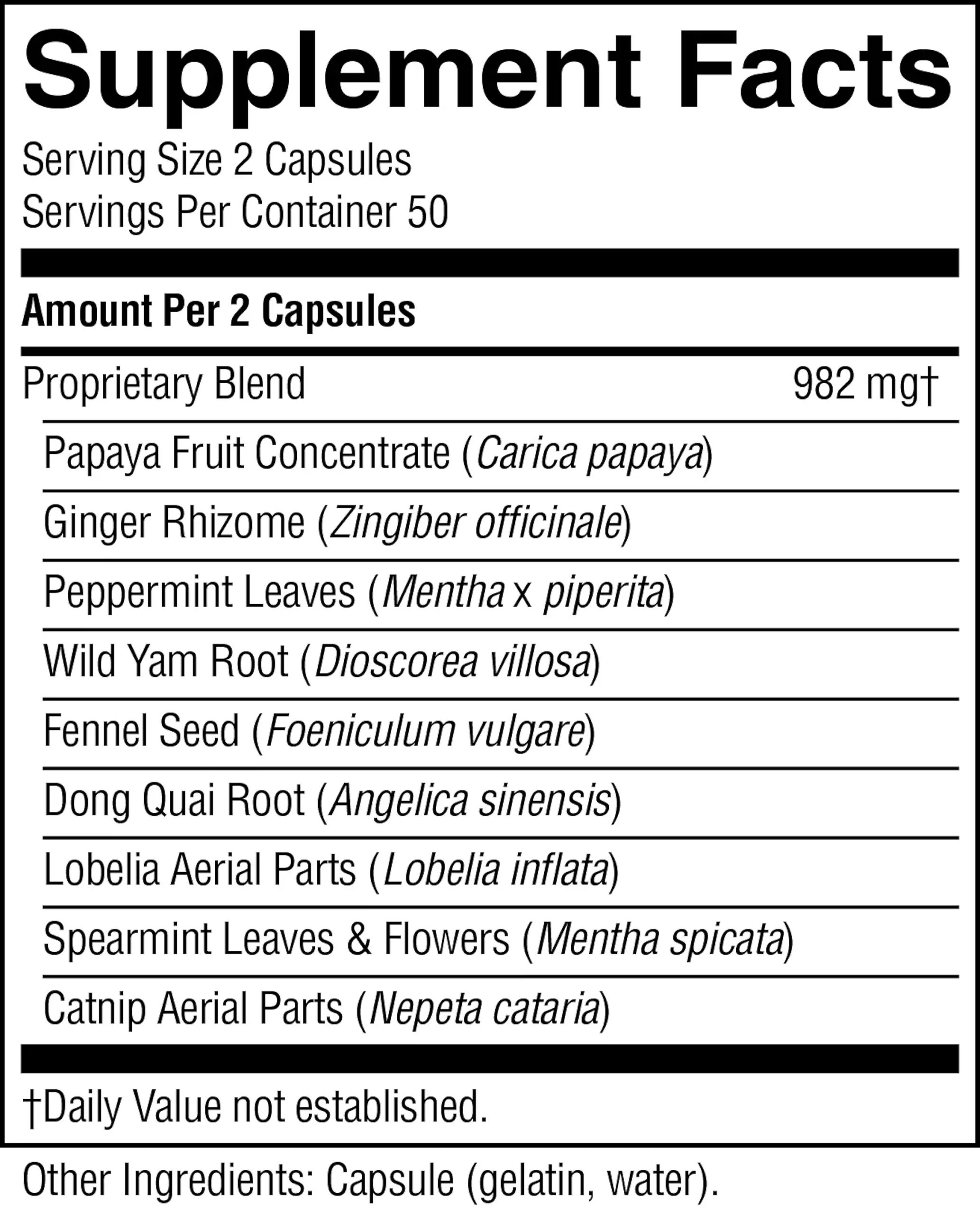 Papaya fruit concentrate, ginger rhizome, peppermint leaves, wild yam root, fennel seed, dong quai root, lobelia aerial parts, spearmint leaves and flowers, and catnip leaves.
