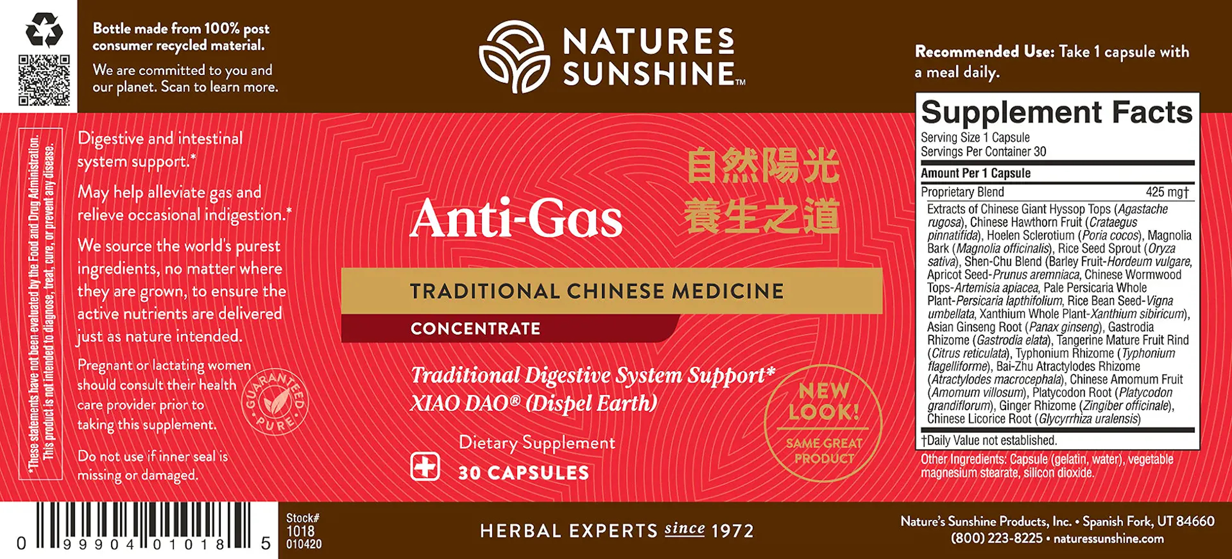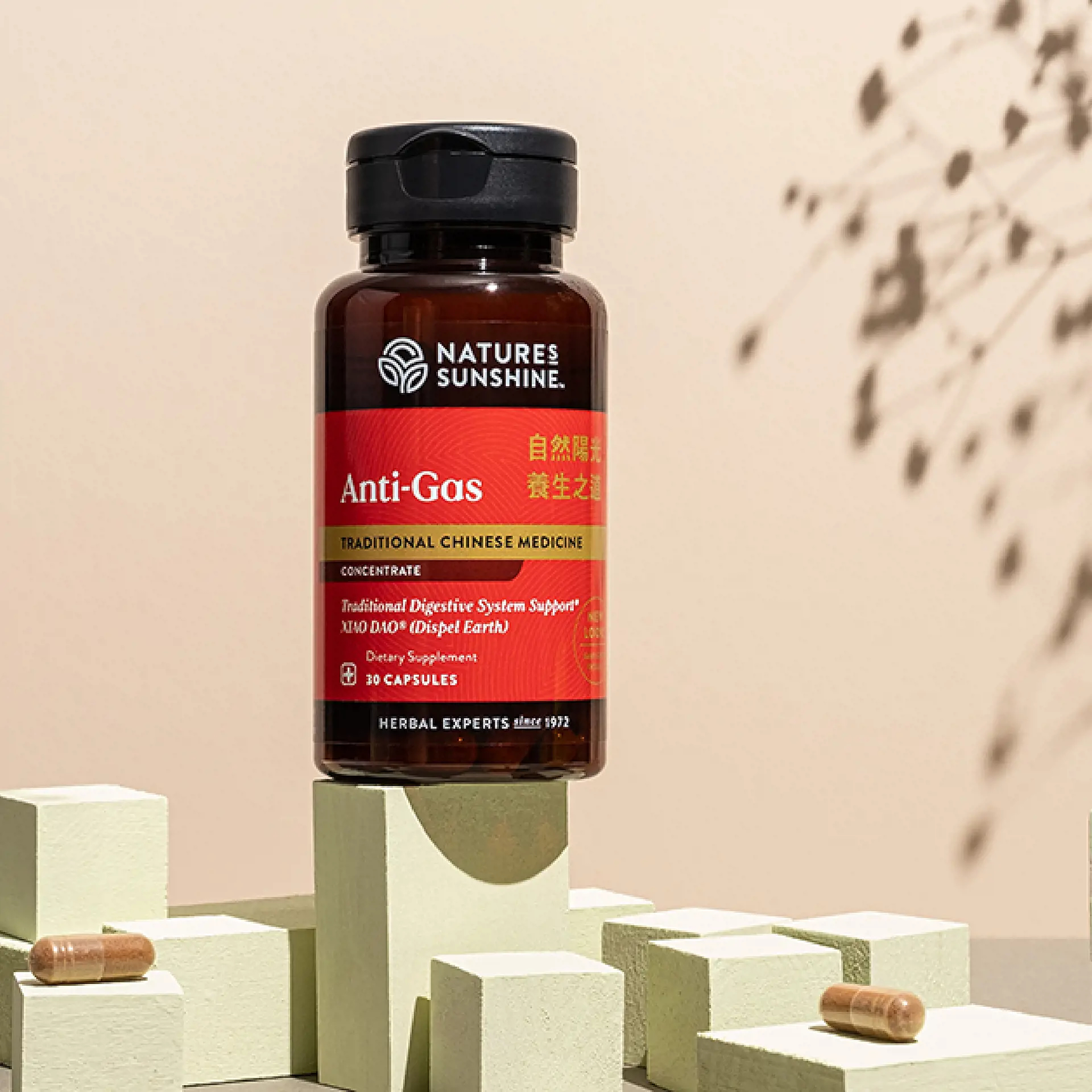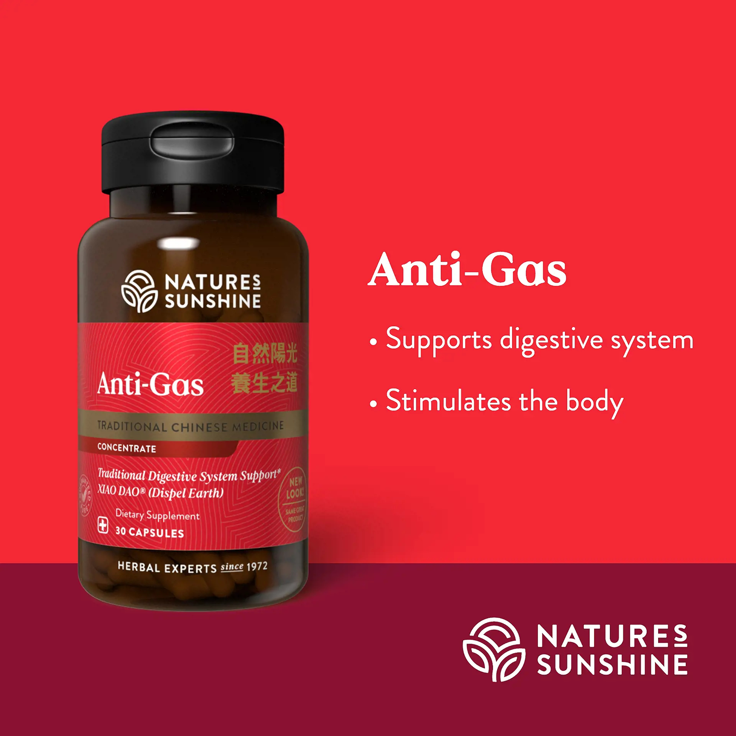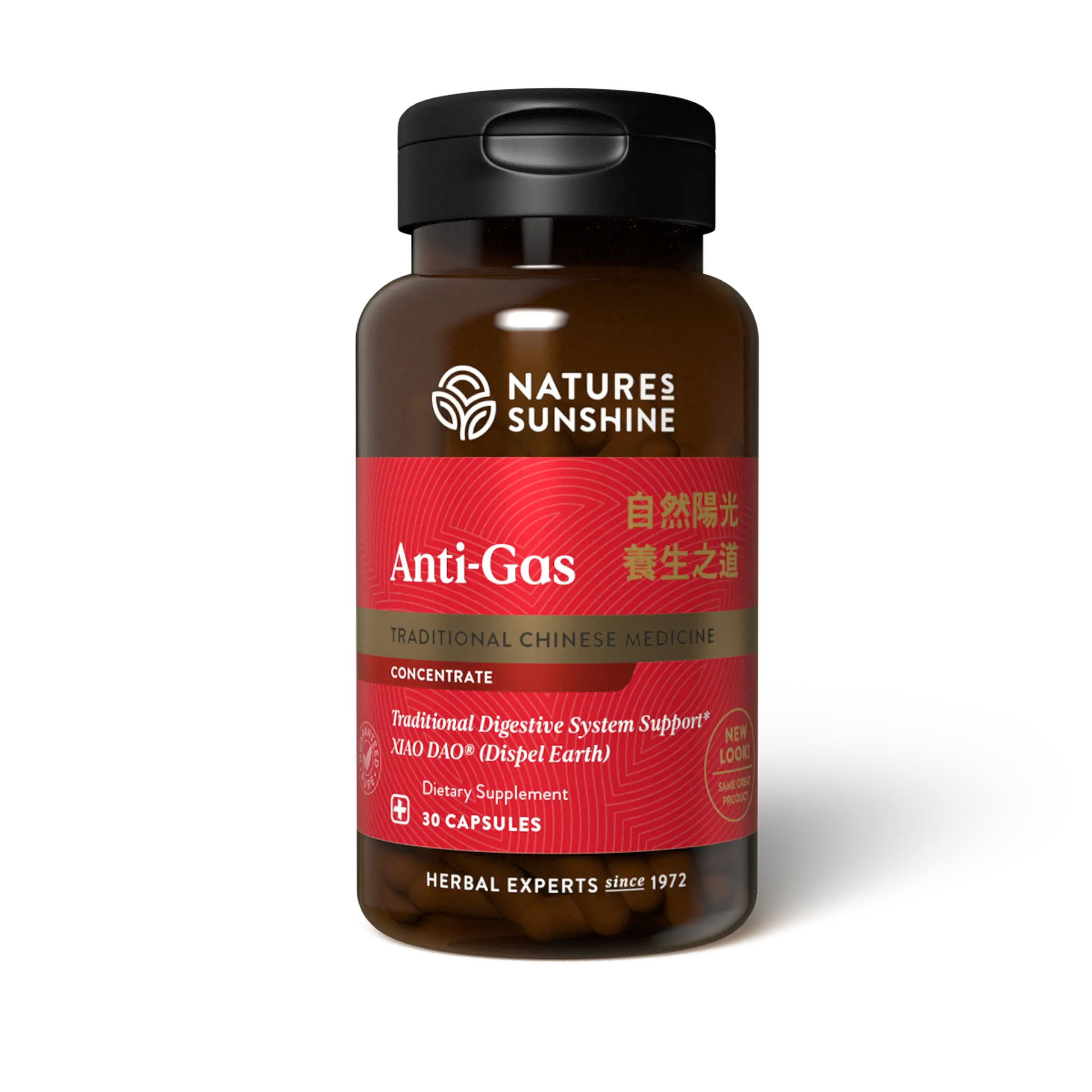 Chinese Anti-Gas is considered “earth reducing” in Chinese herbology. Its Chinese name xiao dao can be translated as “clear the congestion.” Under Chinese philosophy, this formula is designed to move energy (chi) to the head and support the natural elimination of excess moisture and toxins. Its primary herbs include agastache, crataegus fruit, hoelen and gastrodia.