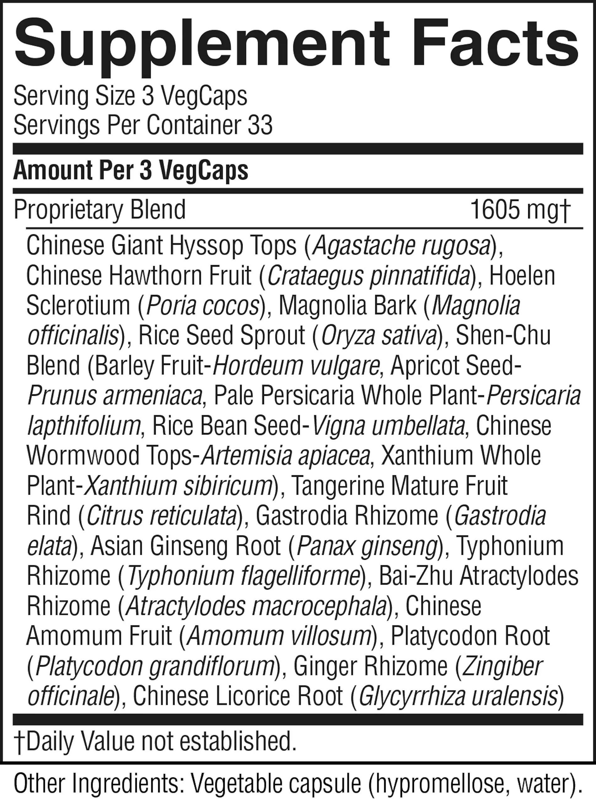 Agastache tops, crataegus fruit, hoelen sclerotium, magnolia bark, oryza fruit shen-chu whole plant, citrus peel, gastrodia rhizome, ginseng root, typhonium rhizome, atractylodes rhizome, cardamon fruit, platycodon root, ginger rhizome and licorice root.