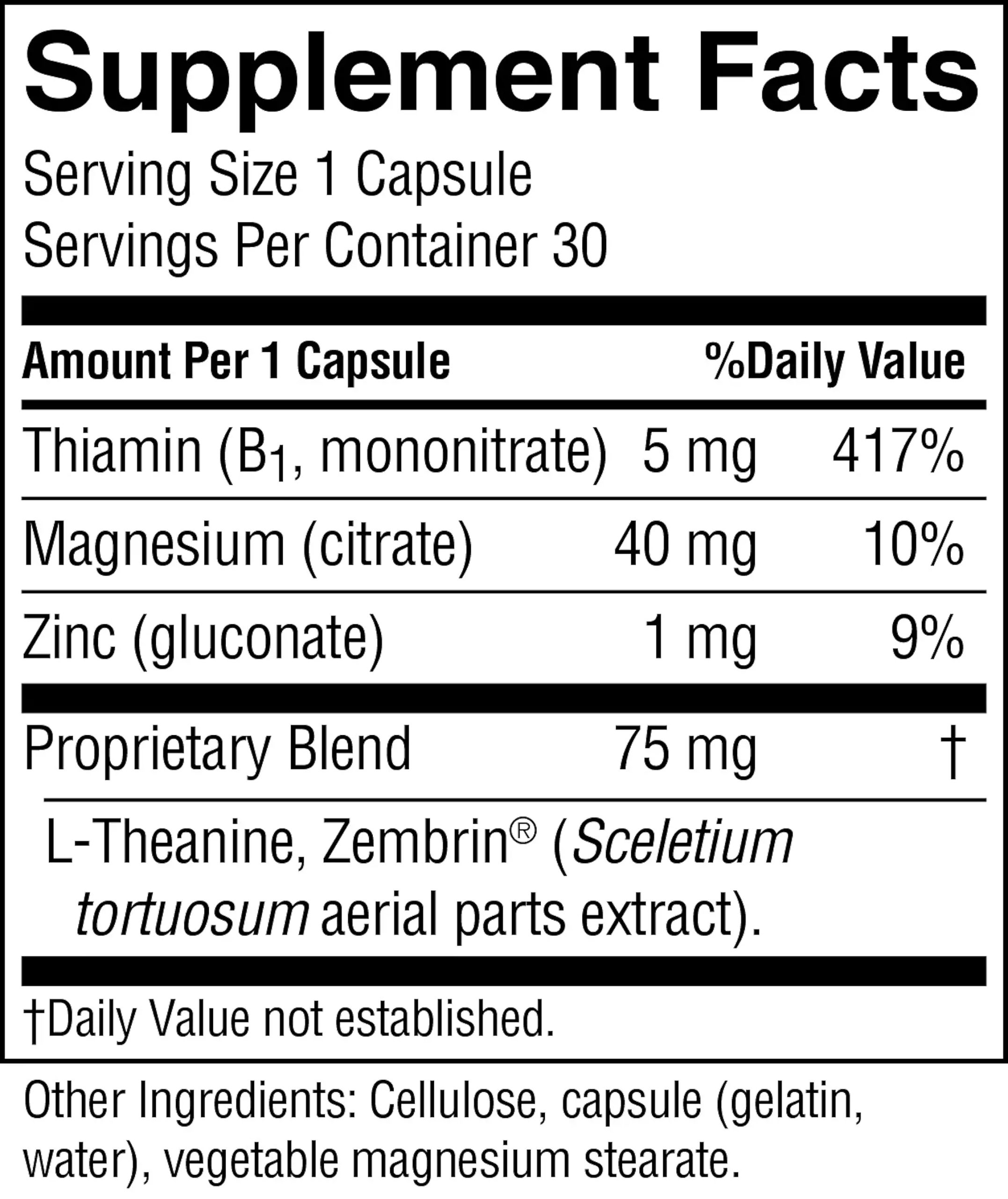 Zembrin (Sceletium tortuosum extract), L-Theanine, Thiamin, Magnesium, Zinc.