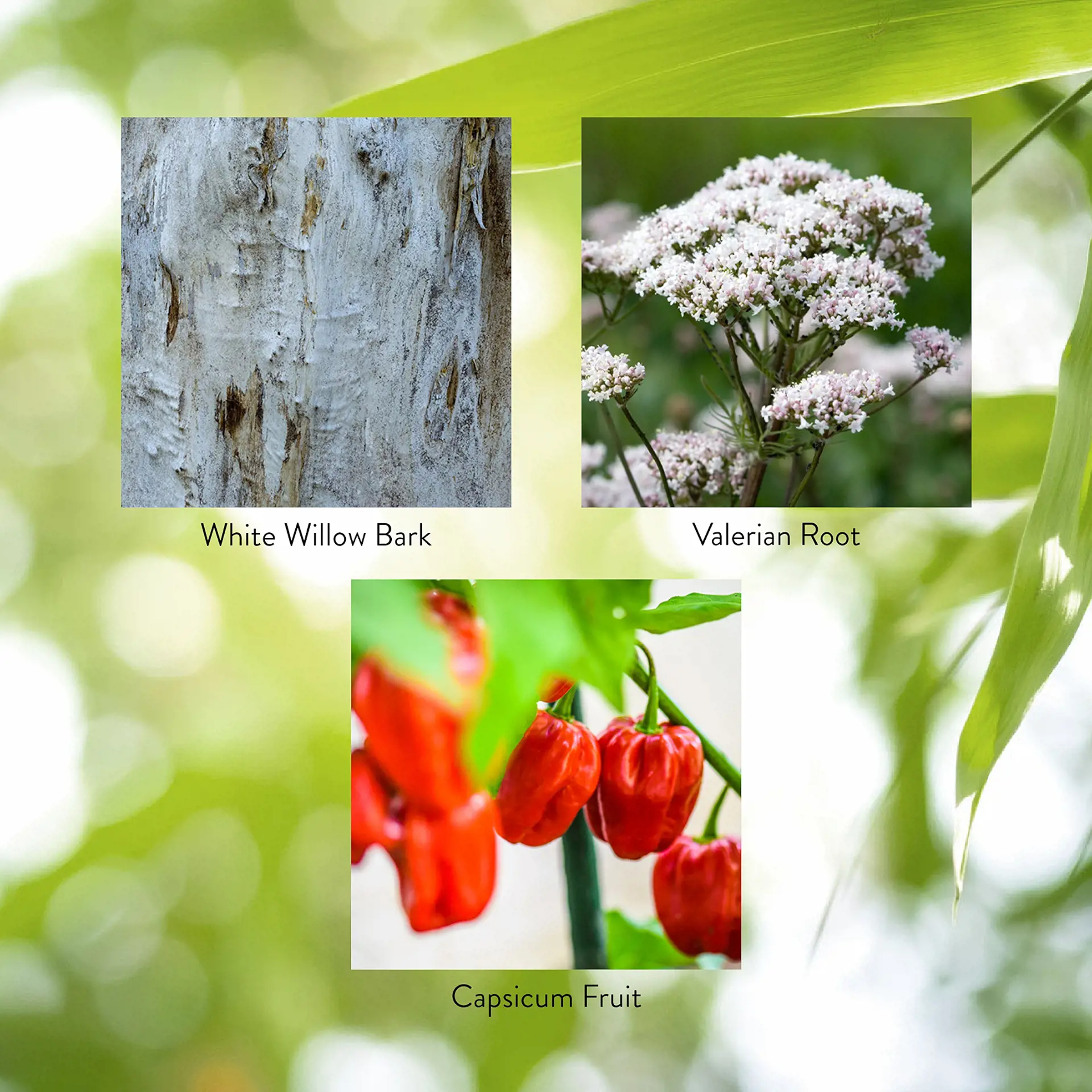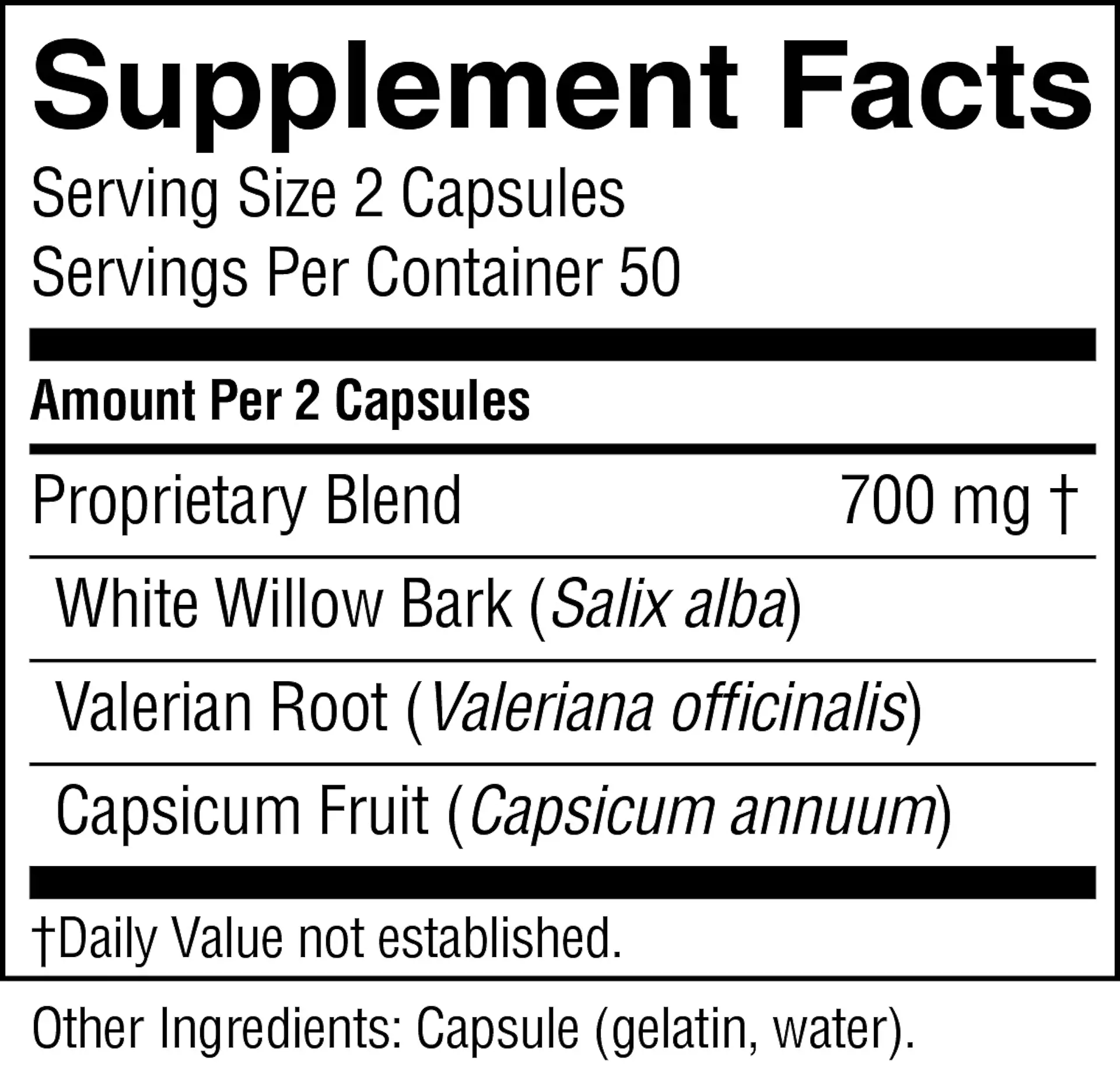 White willow bark contains salicin, a compound chemically similar to salicylic acid. Salicin appears to help prevent the production of prostaglandins. Valerian root provides additional nervous system support, including promoting feelings of relaxation.