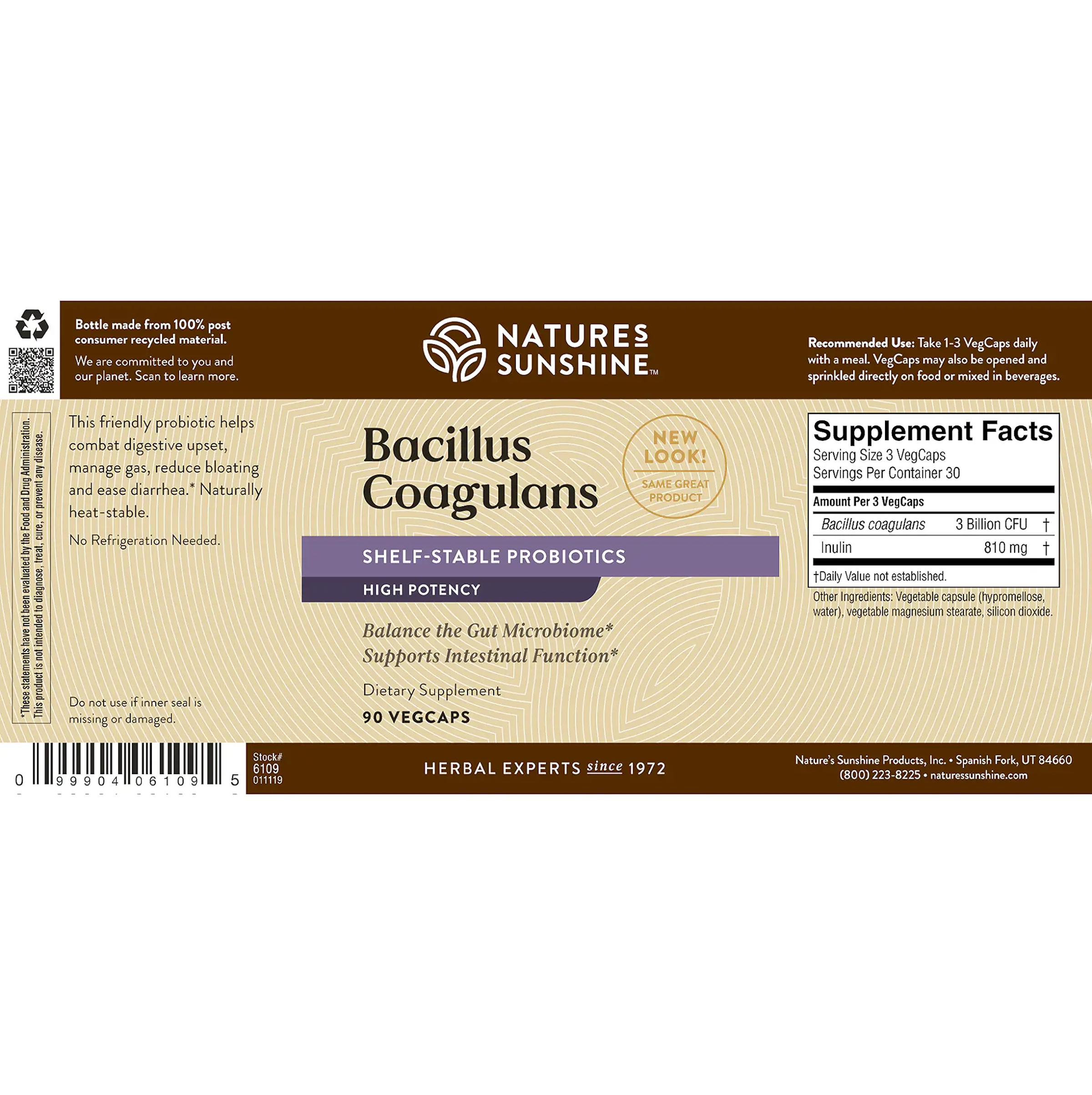 Contains 3 billion CFU (colony forming units) of Bacillus coagulans per serving plus prebiotic fiber