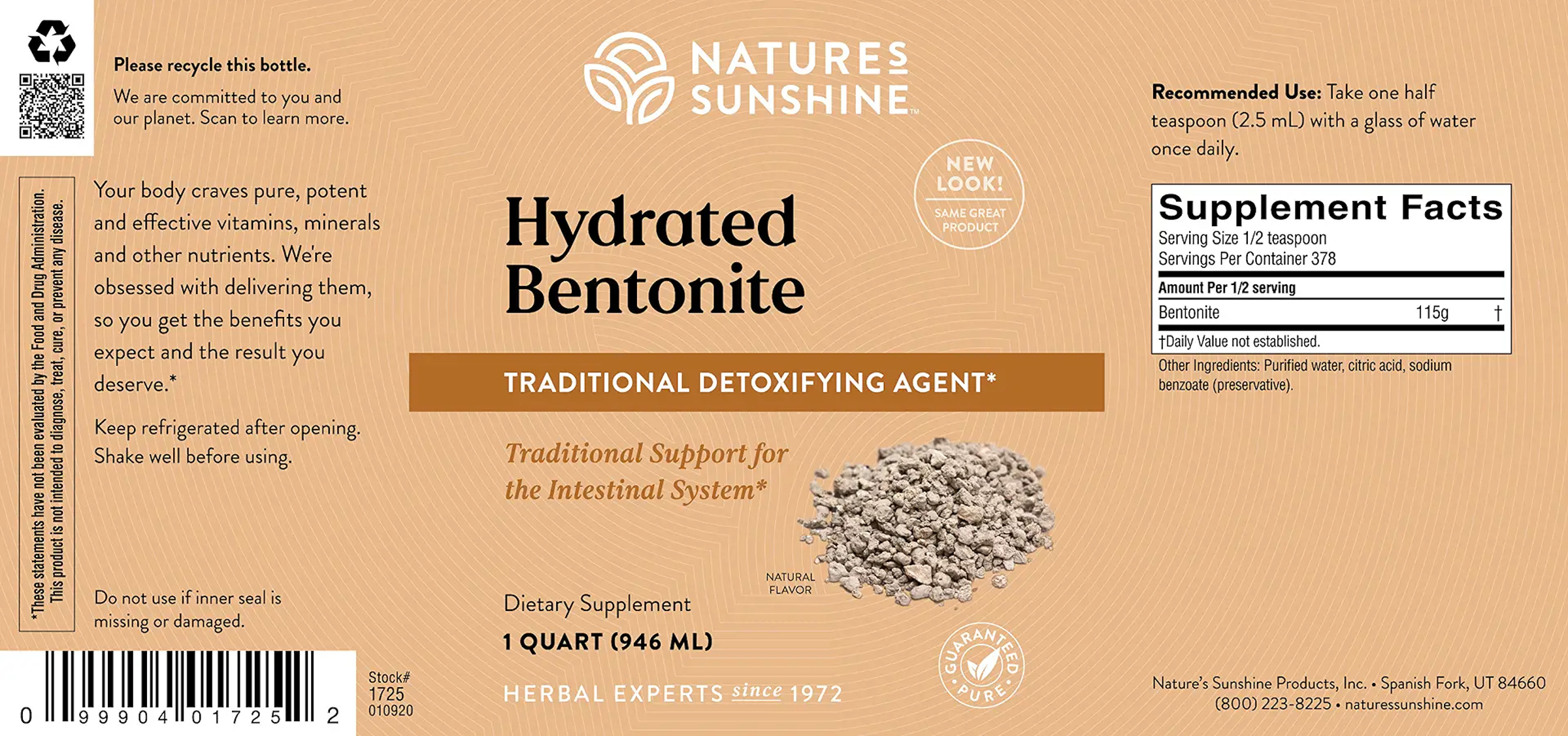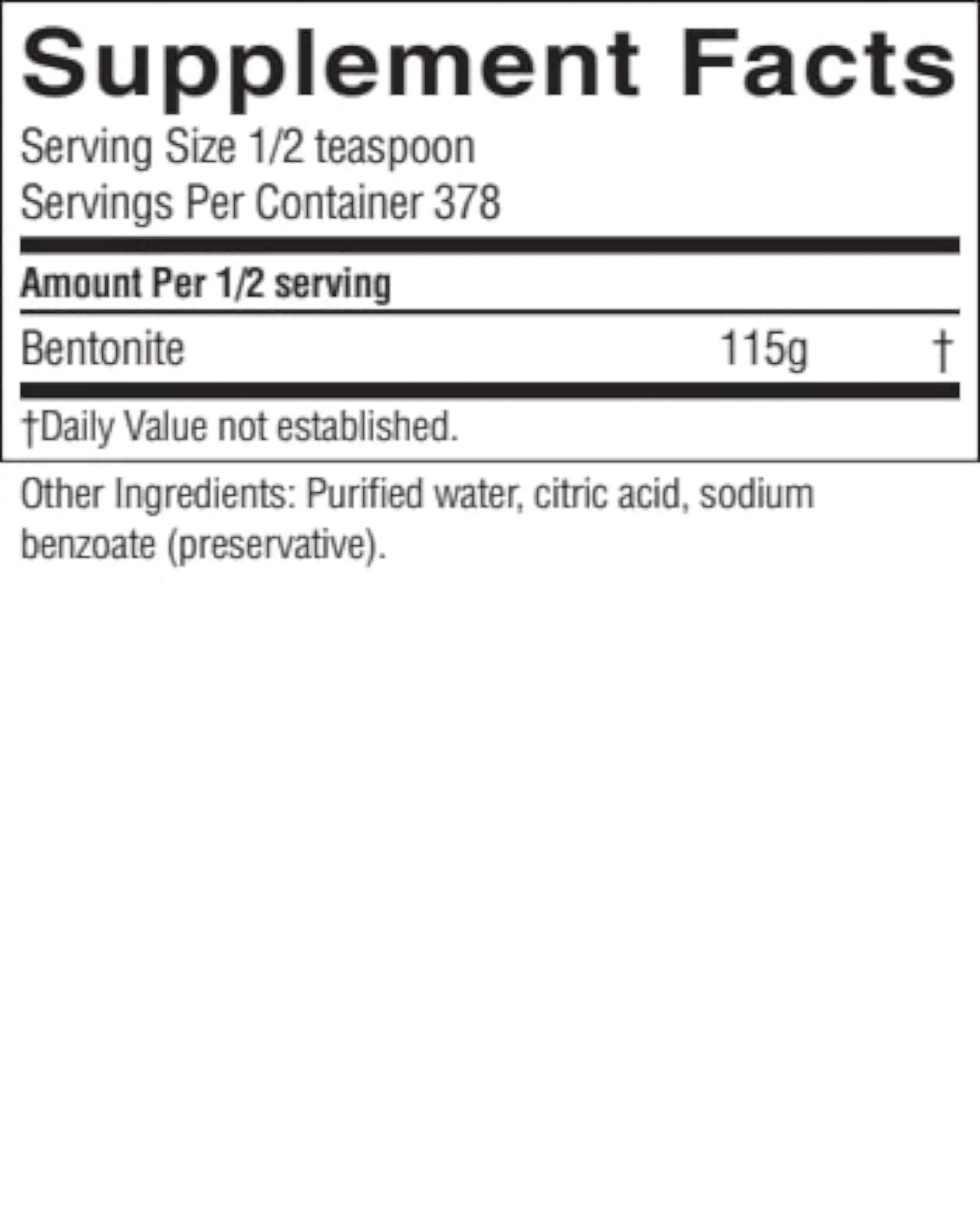 Bentonite is a natural clay that comes from volcanic ash. Taken internally, it supports the intestinal system in the elimination of toxins. This product is made by suspending microfine USP-grade bentonite in purified water.