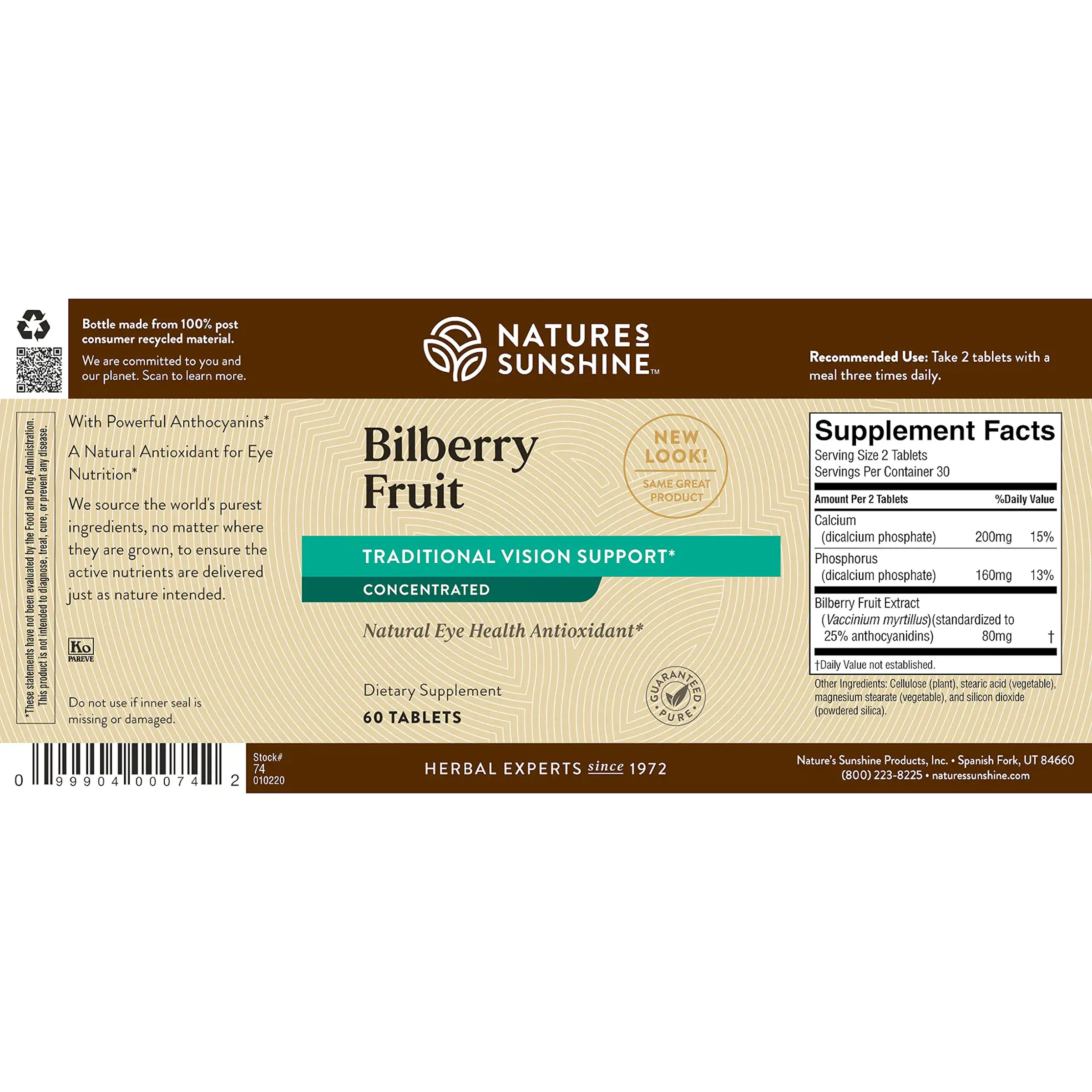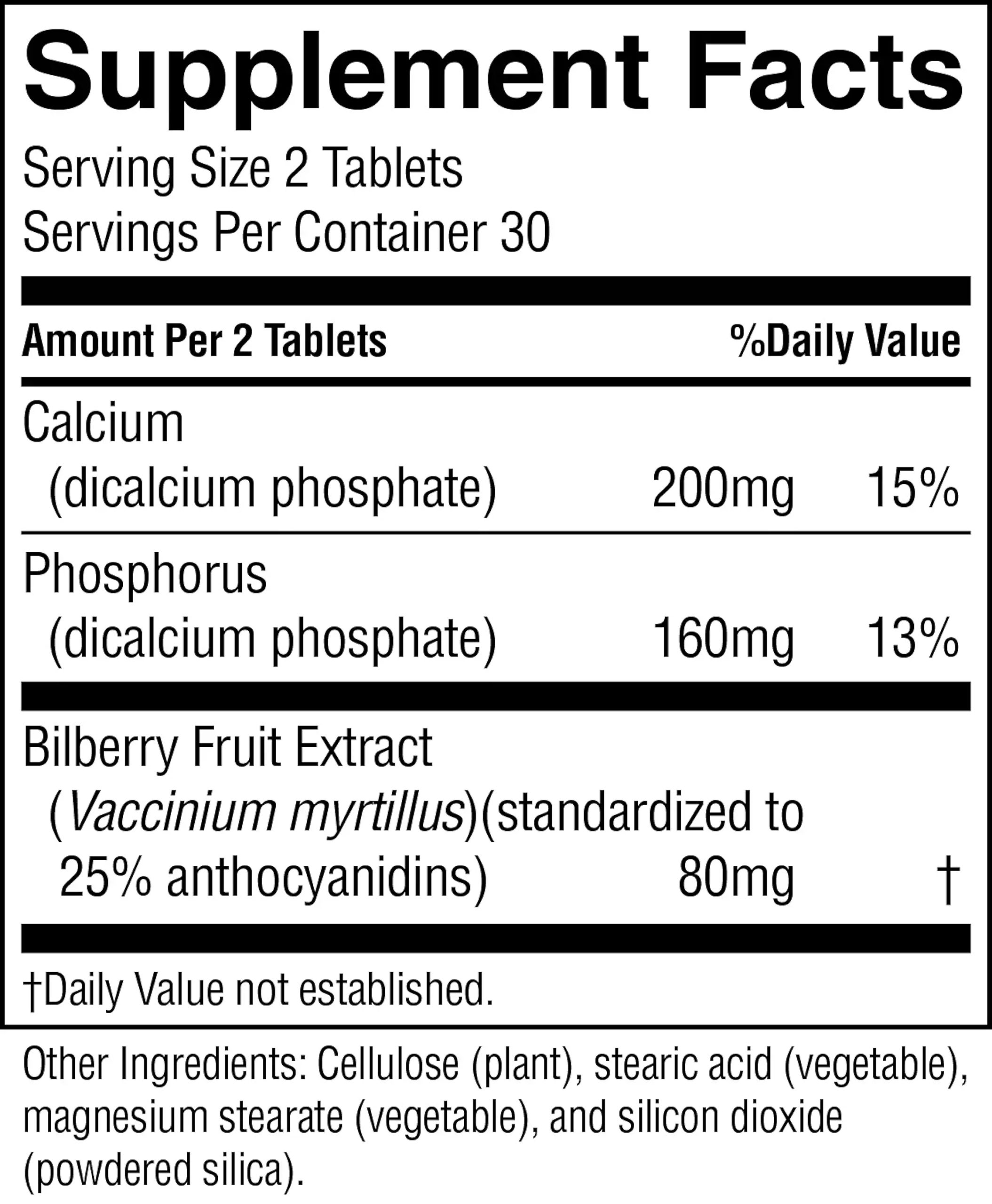 200 mg calcium, 160 mg phosphorus and bilberry fruit extract