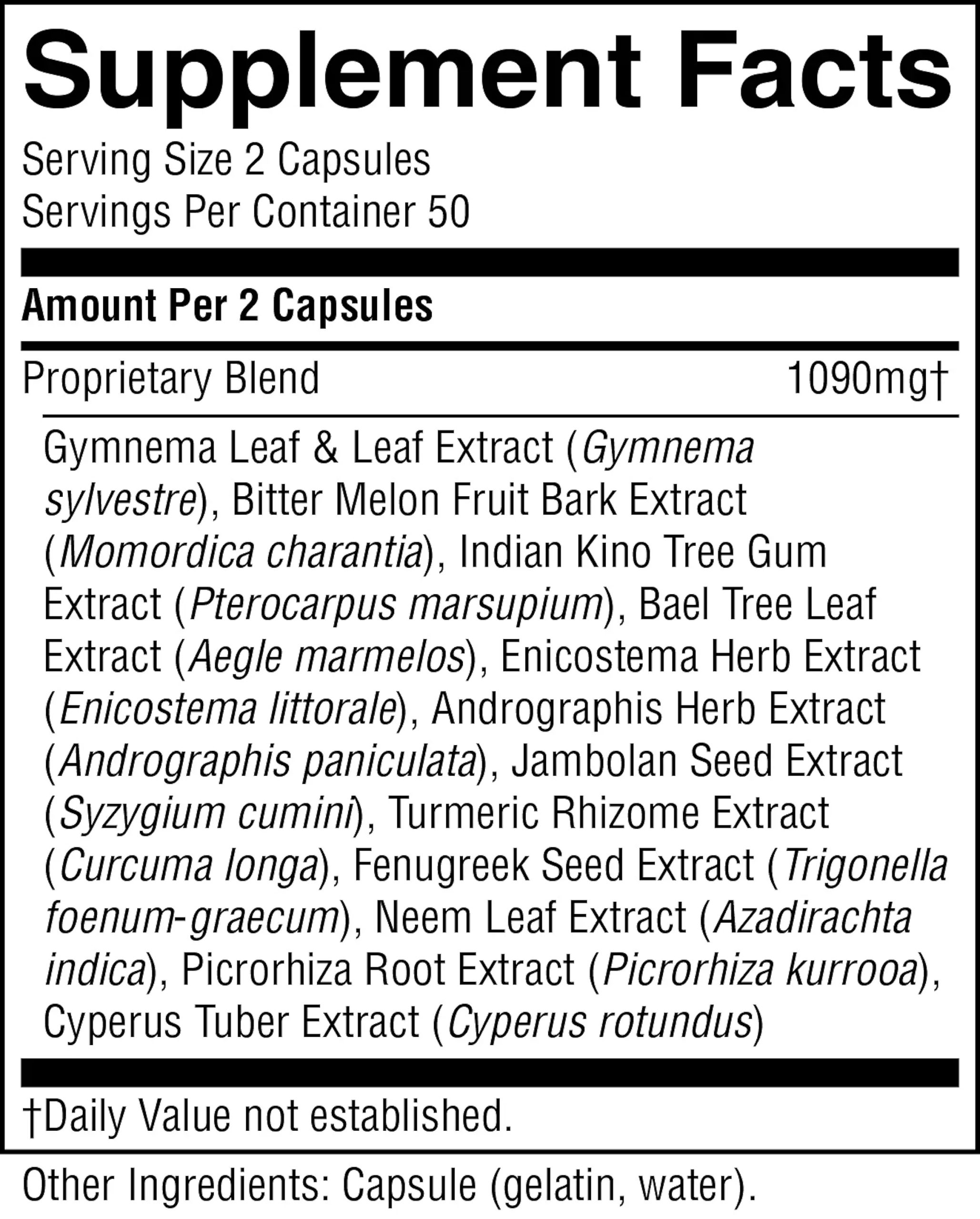 Gymnema sylvestre leaf extract, Momordica charantia fruit bark extract, Pterocarpus marsupium gum extract, Aegle marmelos leaf extract, Enicostemma littorale herb extract, Andrographis paniculata herb extract, Curcuma longa rhizome extract, Syzygium cumini seed extract, Azadirachta indica leaf extract, Picrorhiza kurroa root extract, Trigonella foenum-graecum seed extract and Cyperus rotundus tuber extract.