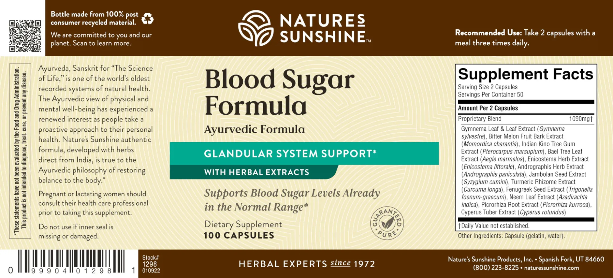 Ayurveda, Sanskrit for “The Science of Life,” is one of the world’s oldest recorded systems of natural health preserved through the ages on scrolls and manuscripts. The Ayurvedic view of physical and mental well-being – a healthy way of living, has experienced a renewed interest as people take a proactive approach to their personal health. Nature’s Sunshine authentic formula, developed with herbs direct from India, is true to the Ayurvedic philosophy of restoring balance to the body. The blood supplies a certain amount of glucose to the body in order to maintain optimal energy levels. The level of glucose in the blood is largely determined by liver and pancreatic functions. The herbs found in Ayurvedic Blood Sugar Formula provide nutrients for glandular support and normal-range blood sugar levels.