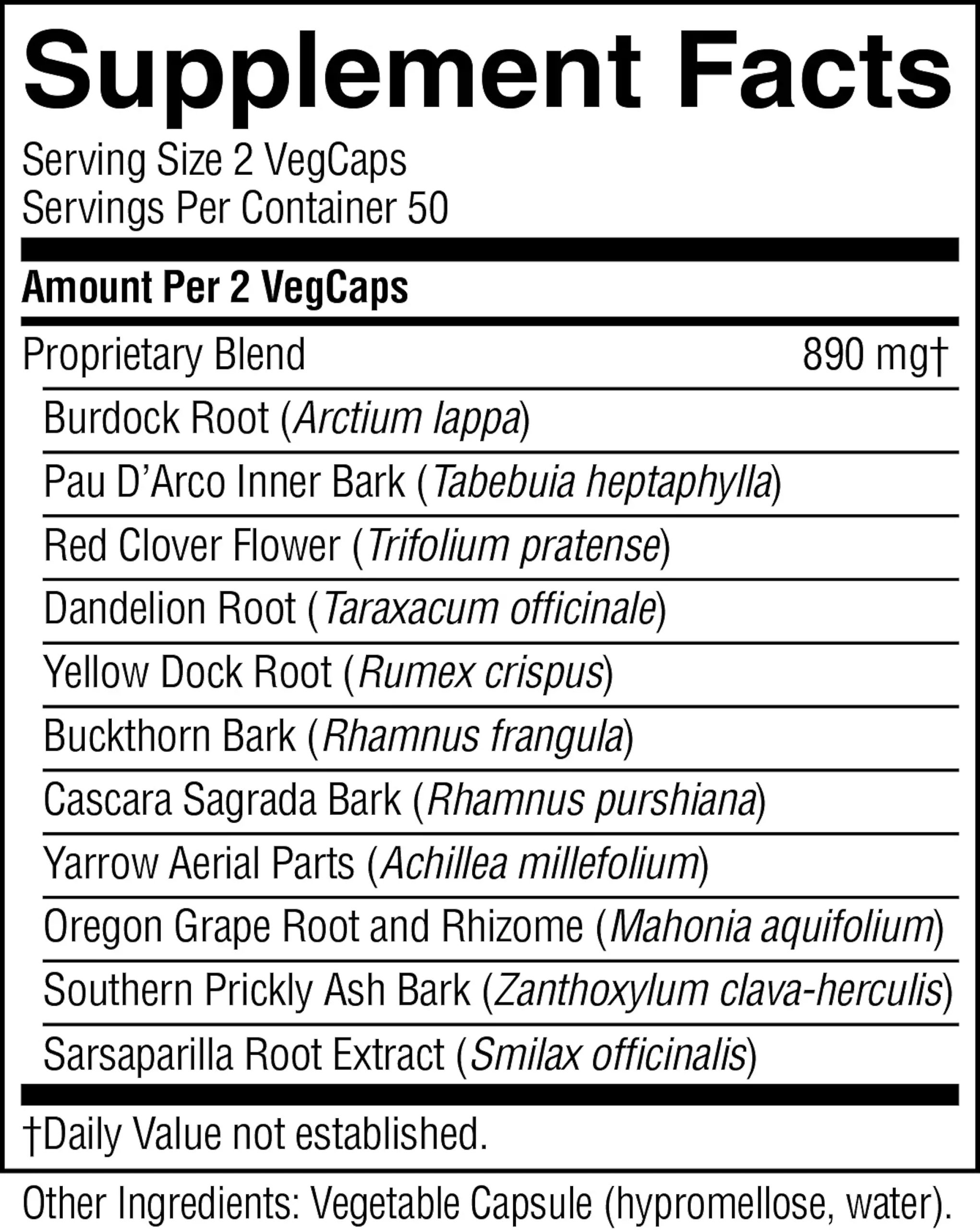 Burdock root, pau d’arco bark, red clover tops, dandelion root, sarsaparilla root, yellow dock root, buckthorn bark, cascara sagrada bark, yarrow flowers, Oregon grape root and rhizome, and prickly ash bark