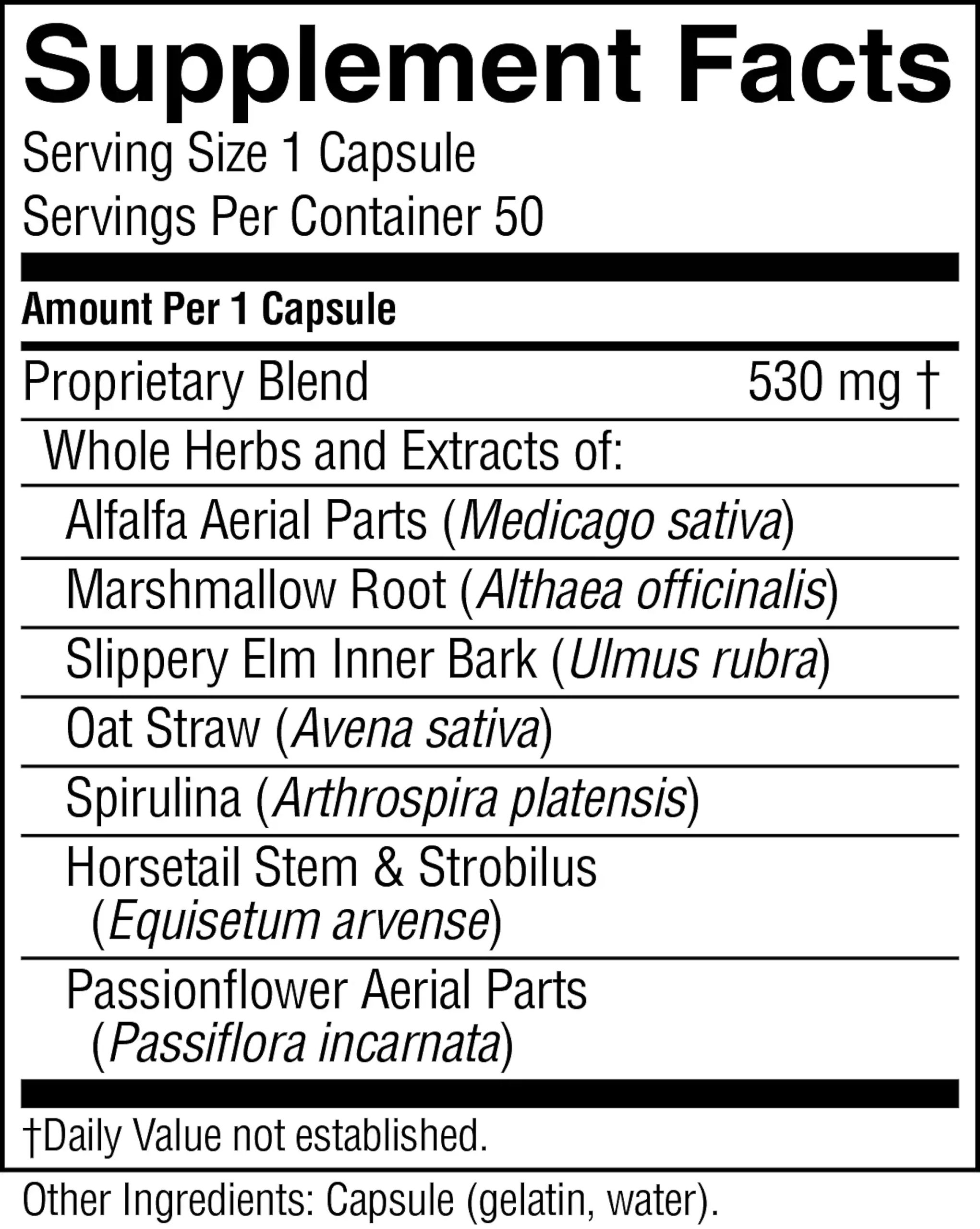 Alfalfa aerial parts, horsetail stem and strobilus, oat straw extract, marshmallow root, slippery elm inner bark, irish moss algae, passionflower aerial parts