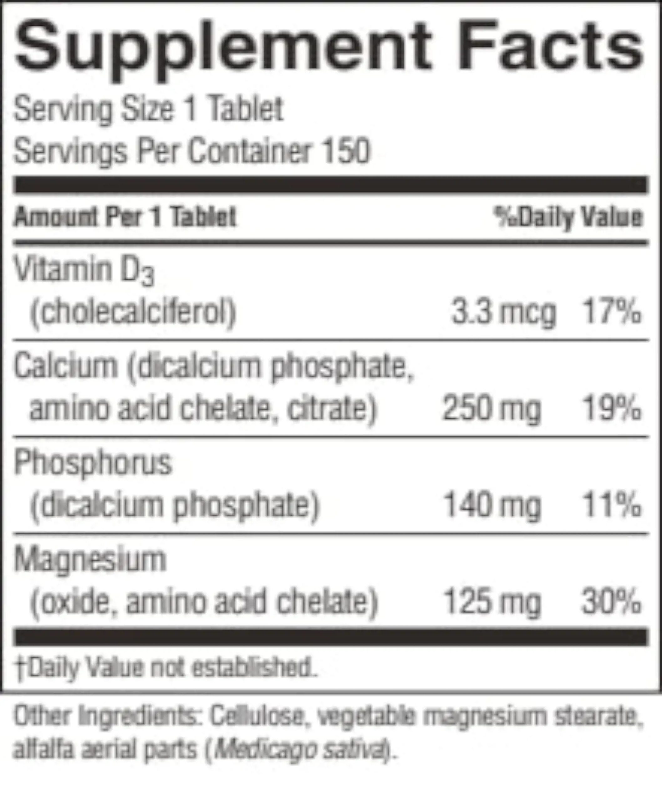 133 IU vitamin D3 (30% Daily Value), 250 mg calcium (25% DV), 140 mg phosphorus (10% DV), 125 magnesium (30% DV) and alfalfa aerial parts