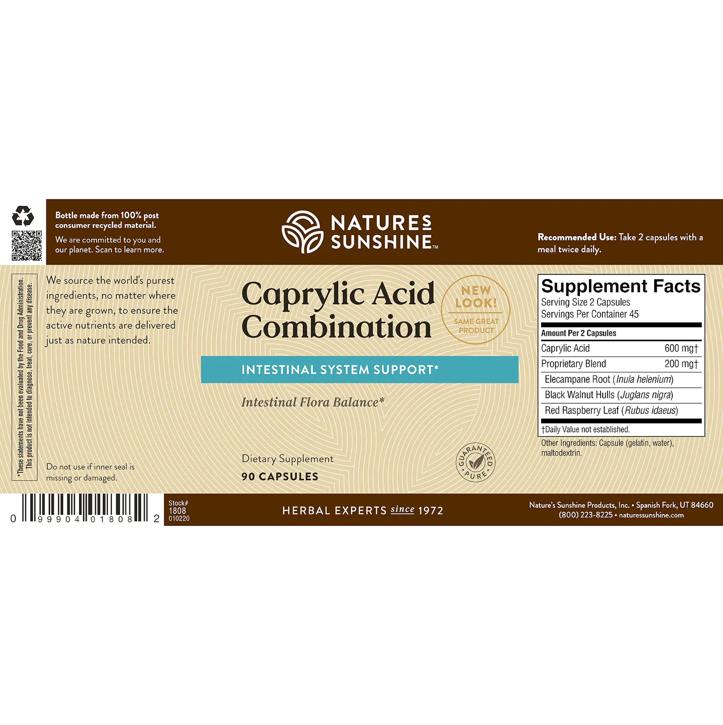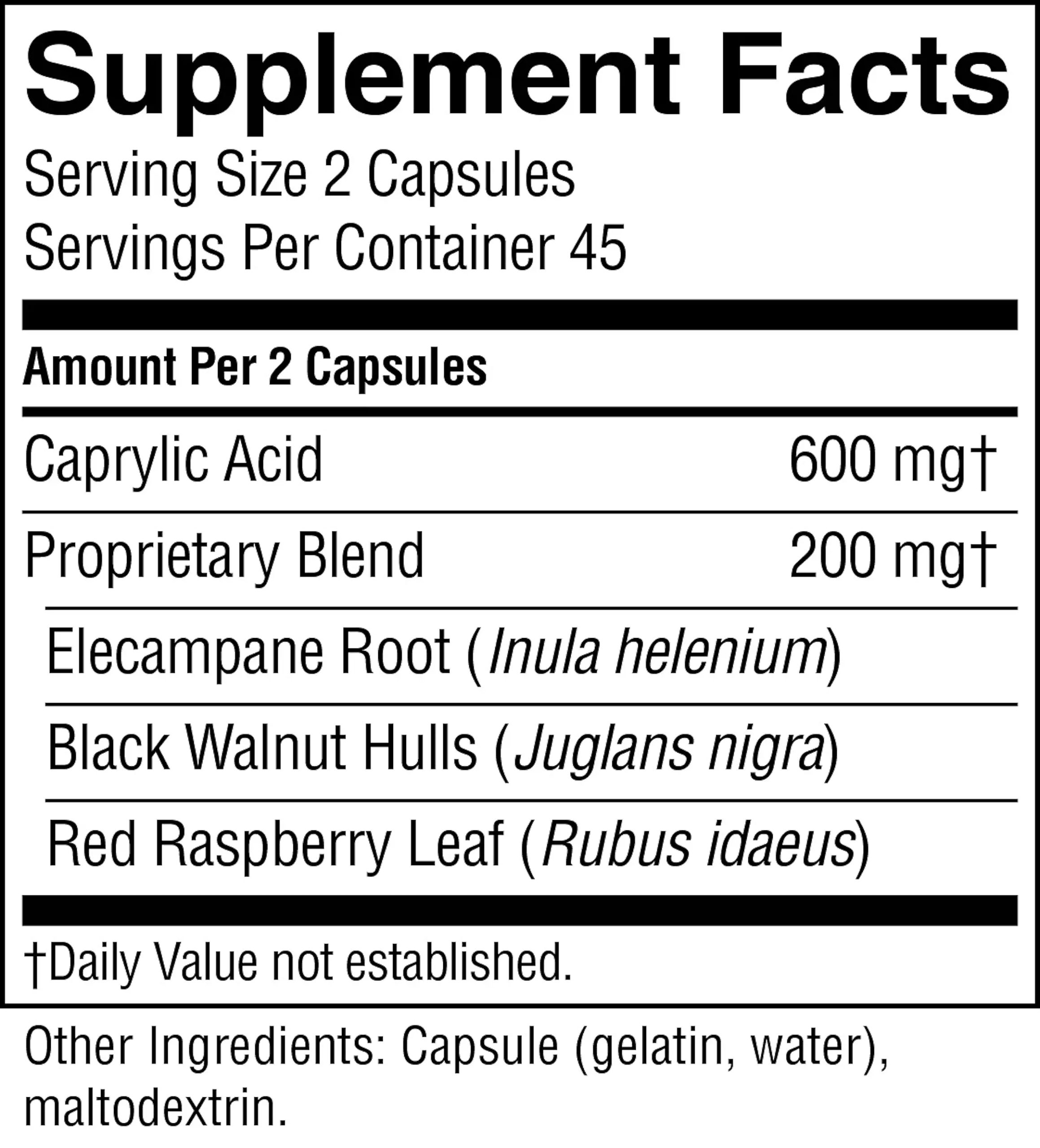 Caprylic acid, elecampane root, black walnut hulls and red raspberry leaves.