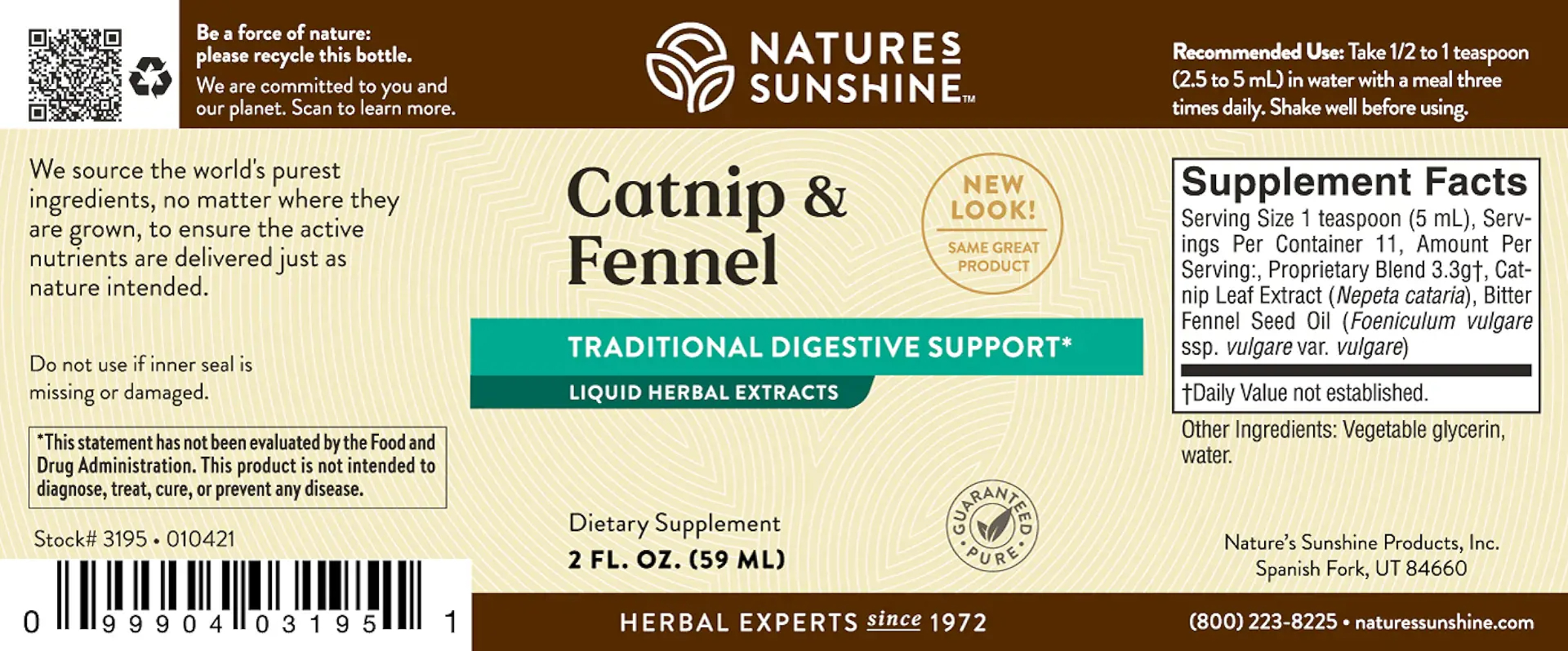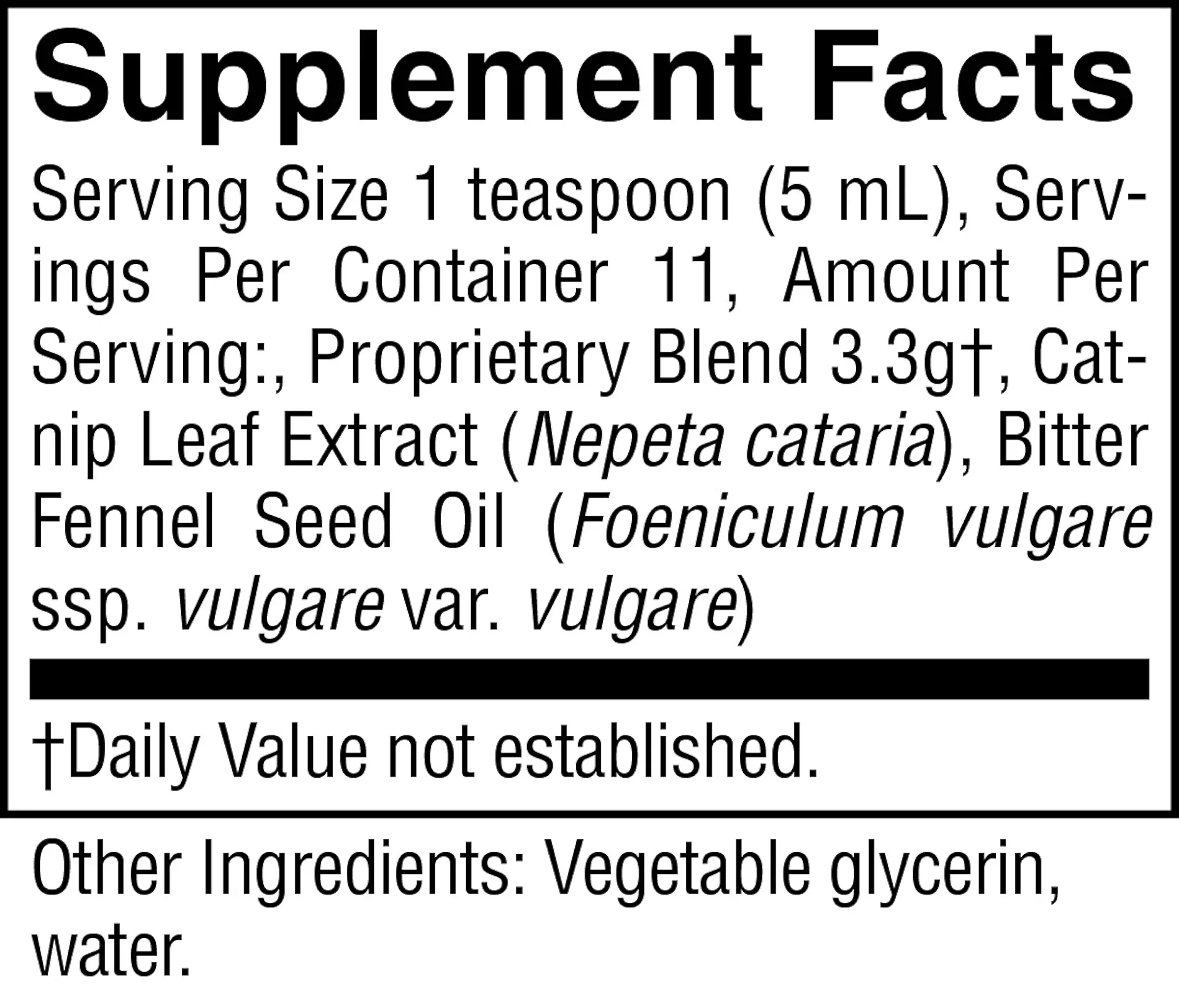 Adults: Take 1/2 to 1 teaspoon in water with a meal three times daily. Children: Take 1/4 teaspoon in water with a meal three times daily. Shake well before using. One ml is equal to 1 capsule of catnip and 1 capsule of fennel.