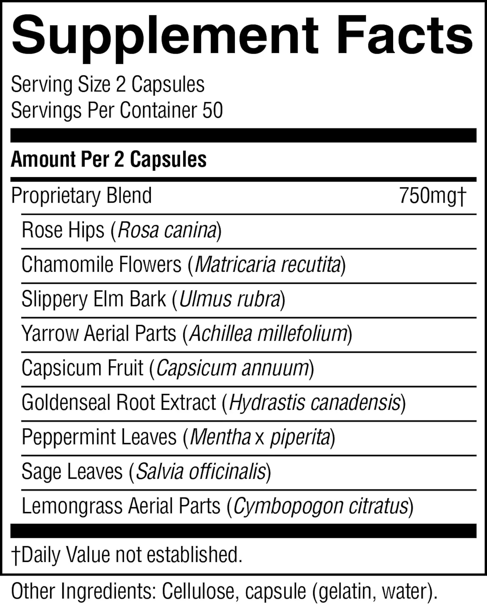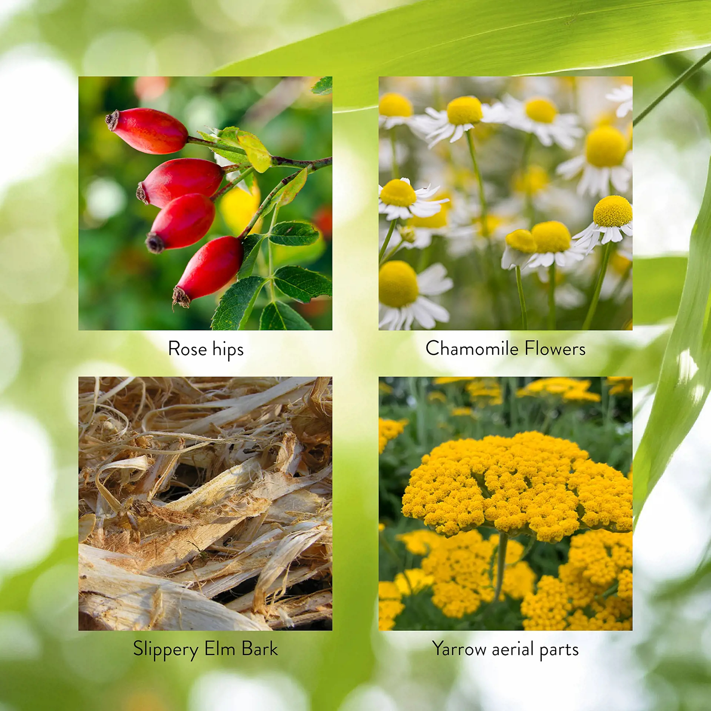 Rose hips, chamomile flowers, slippery elm bark, yarrow aerial parts, capsicum fruit, goldenseal root extract and rhizome, peppermint leaves, sage leaves and lemongrass aerial parts