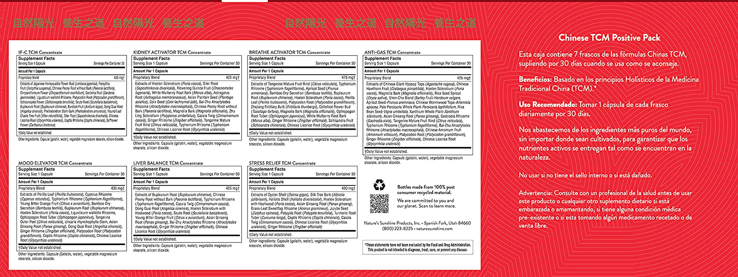 Includes one bottle each of the following Chinese TCM Concentrates:Anti-Gas, IF-C, Kidney Activator, Liver Balance, Stress Relief, Mood Elevator and Breathe Activator TCM.