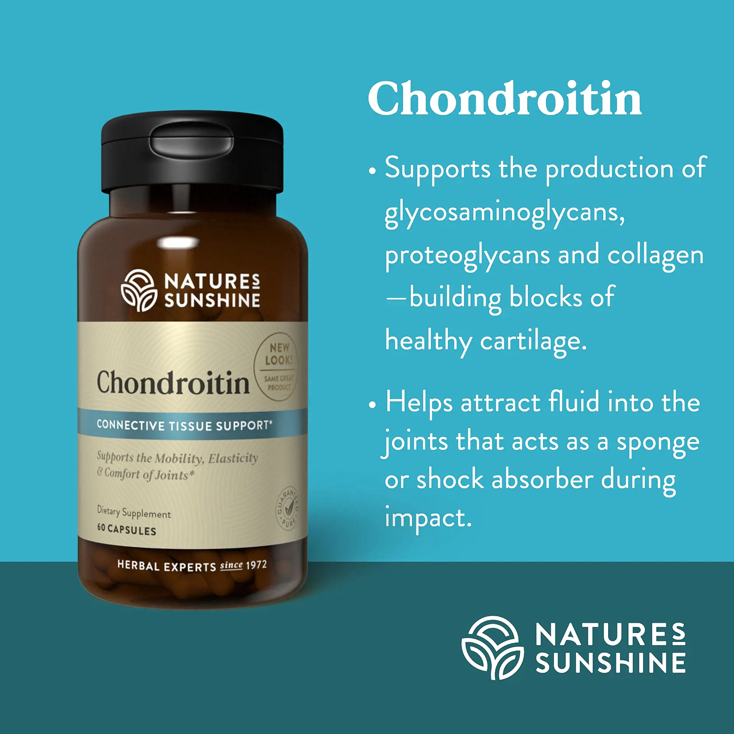 Cartilage functions to protect bones from moving against each other and to reduce friction. Chondroitin helps bond connective tissue to maintain strength and inhibits enzymes that can deplete cartilage nutrition. It helps retain moisture in the joints, allowing for flexibility and resiliency, and cushioning against activities like jumping and lifting. In addition, chondroitin works with other nutrients like glucosamine to stimulate the rebuilding and maintenance of cartilage. The body produces chondroitin, but that production decreases as we age. Chondroitin is found in foods, but usually only in small amounts. Fortunately, the body absorbs chondroitin well, making supplementation a viable alternative.
