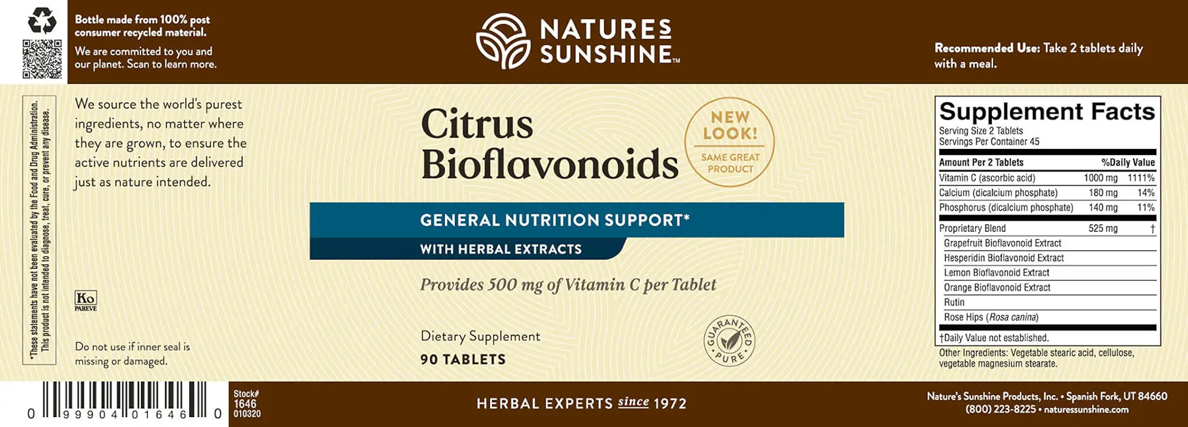 500 mg Vitamin C per tablet (835% of the Daily Value), calcium, phosphorus, grapefruit bioflavonoid extract, hesperidin, lemon bioflavonoid extract, orange bioflavonoid extract, rutin and rose hips