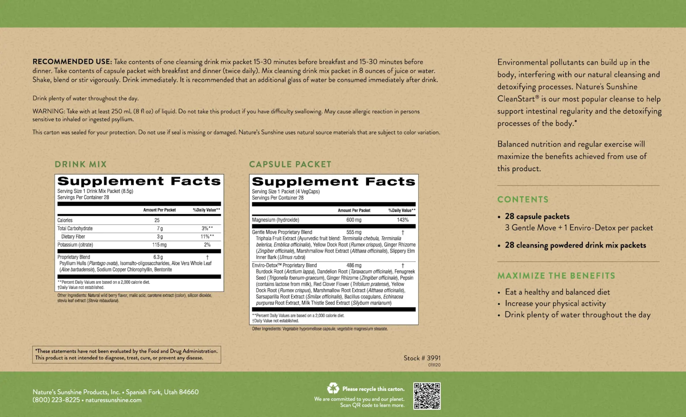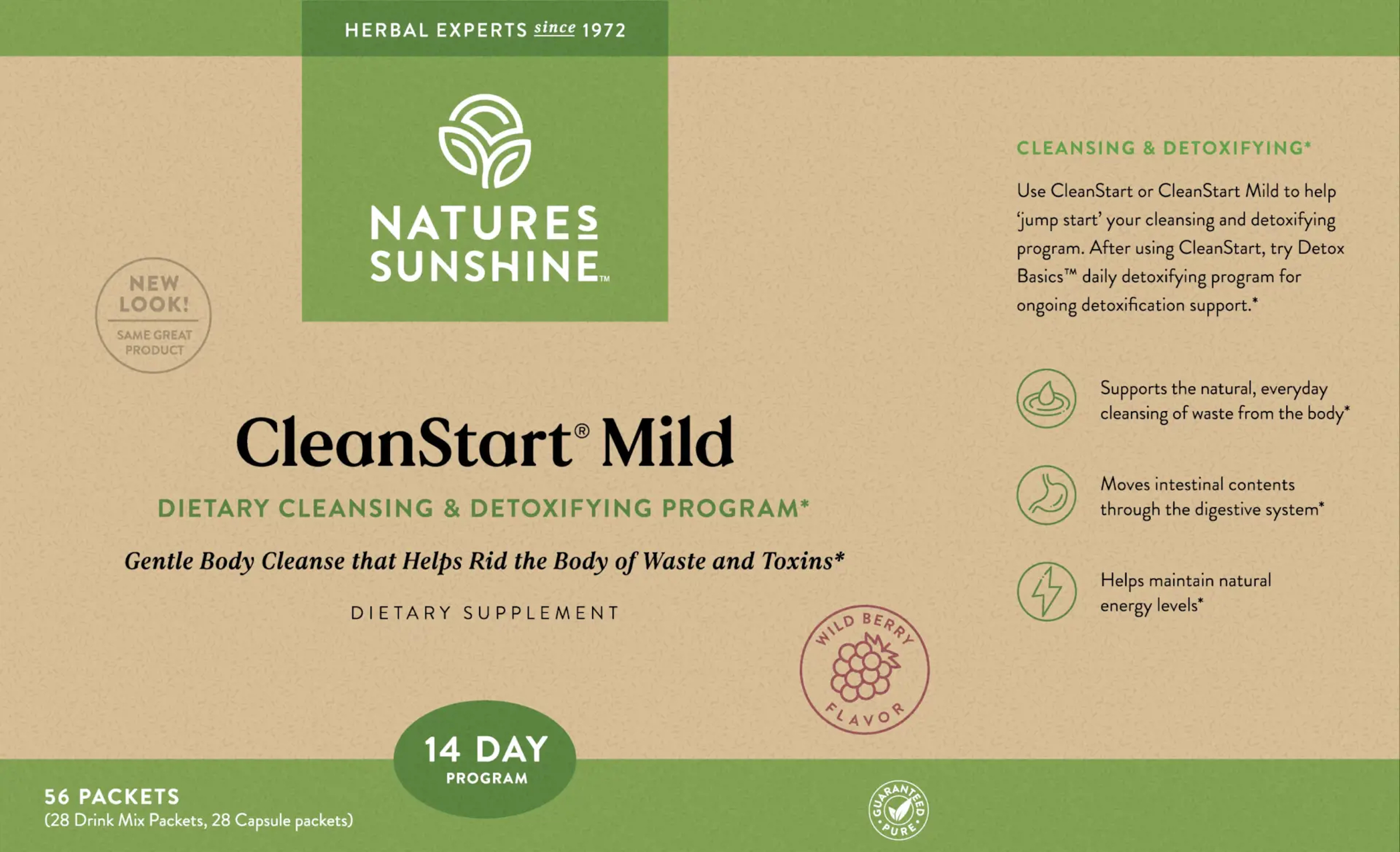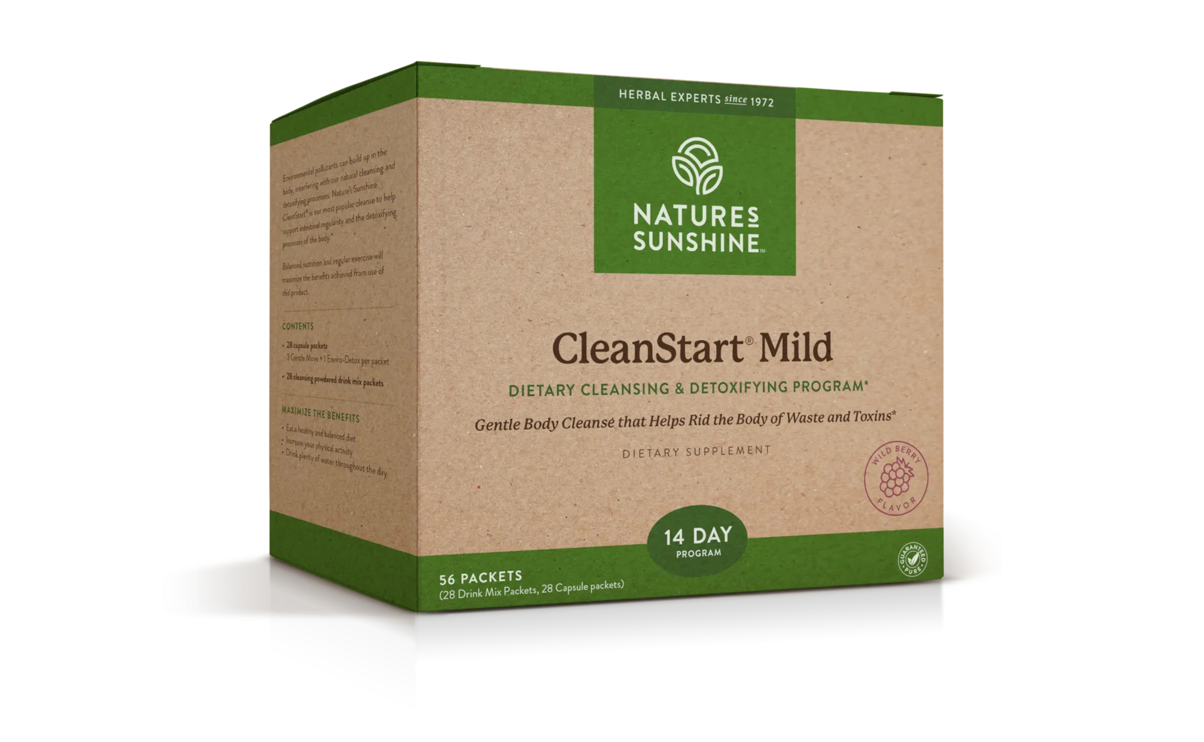 Each Cleansing Drink Mix packet contains psyllium hulls, vegetable fiber, natural wild berry flavor, potassium citrate, aloe vera whole leaf, malic acid, carotene extract, stevia leaf extract, sodium copper chlorophyllin, bentonite. Each capsule pack contains 3 capsules of Gentle Move and 1 capsule of Enviro-Detox™.
