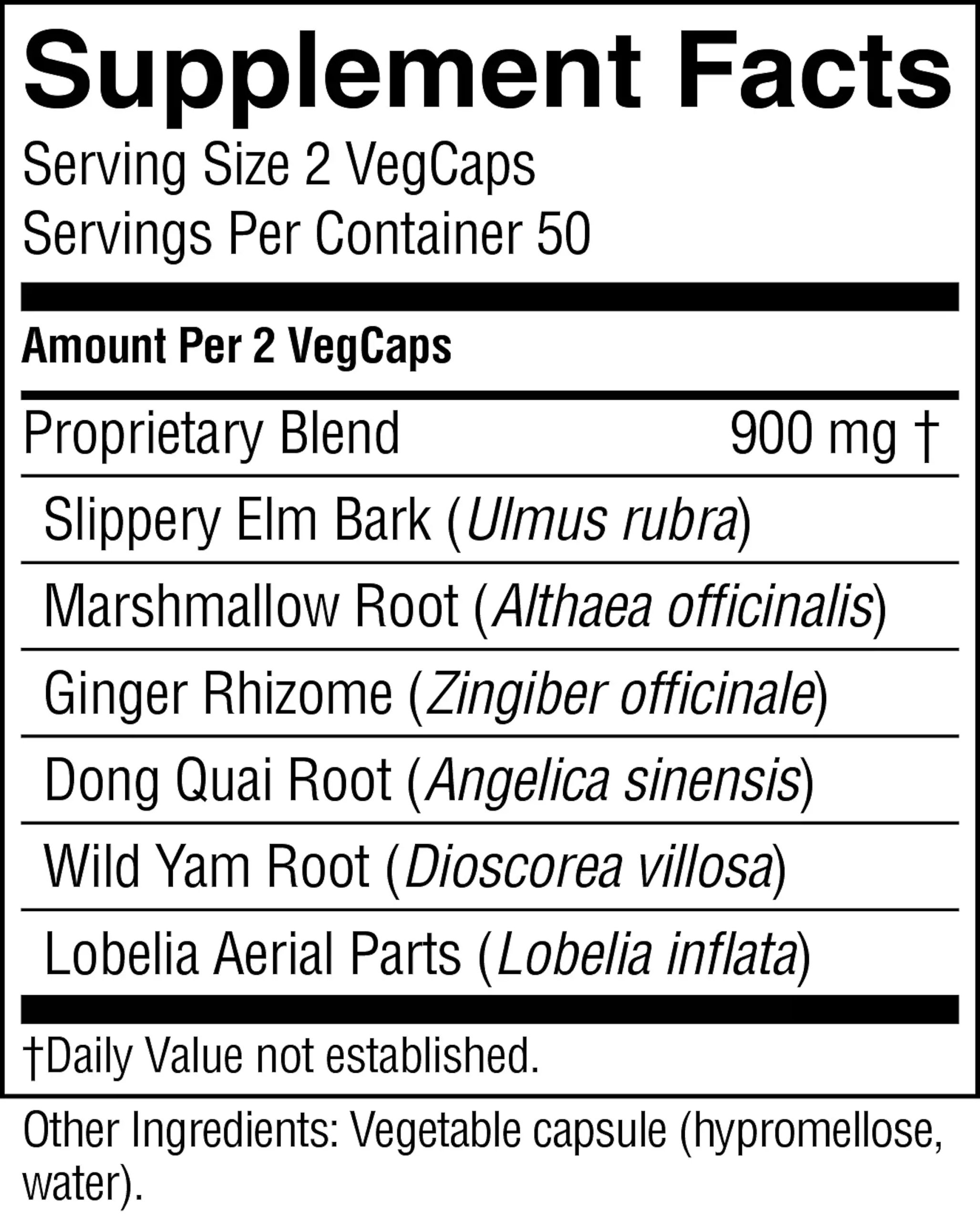 Slippery elm bark, marshmallow root, ginger rhizome, dong quai root, wild yam root and lobelia aerial parts.