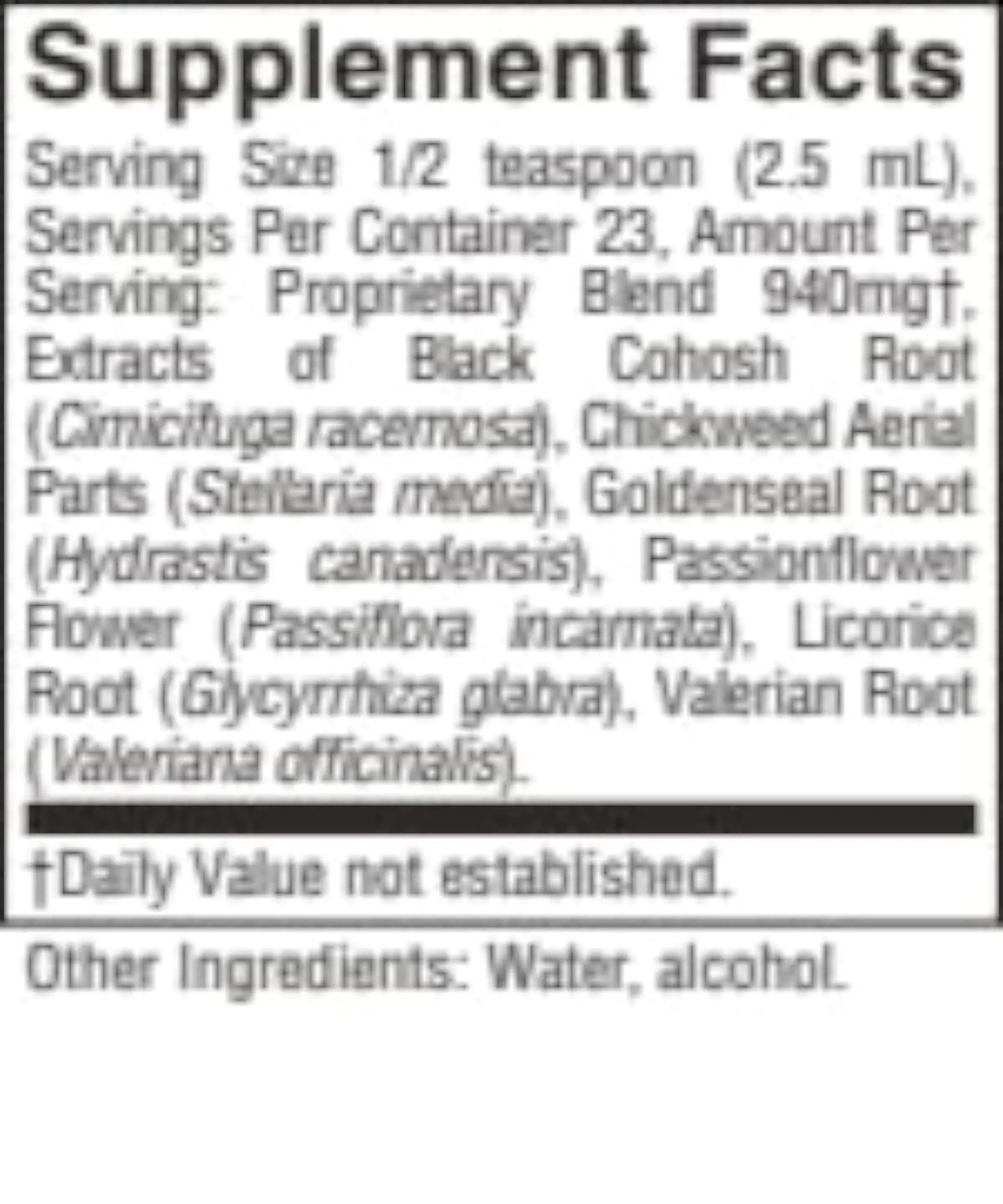 Extract of black cohosh root, chickweed aerial parts, goldenseal root, passionflower aerial parts, Chinese licorice root and valerian root in water and alcohol.