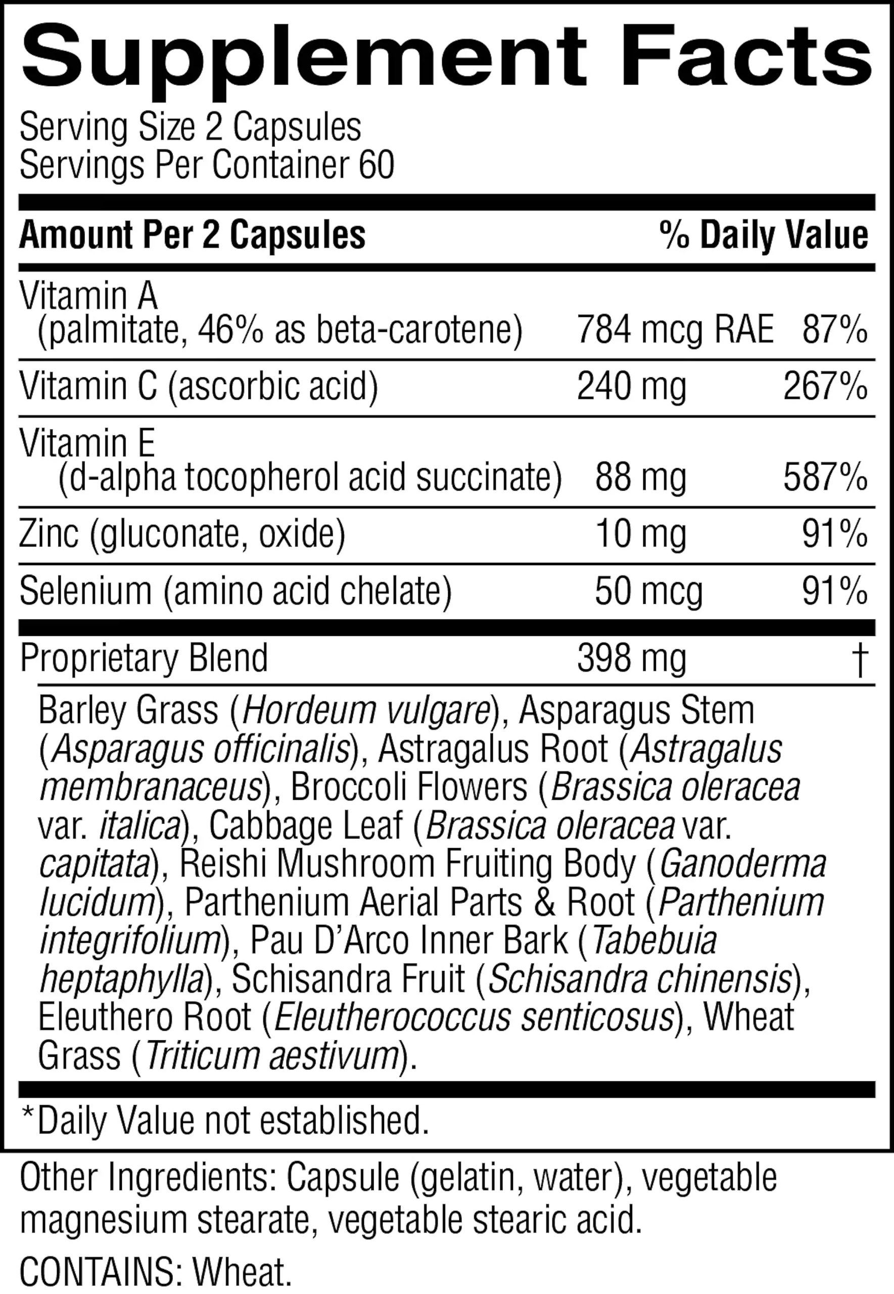 Vitamins A (beta-carotene), C and E, zinc, selenium, barley grass, asparagus stem, astragalus root, broccoli flowers, cabbage leaf, reishi mushroom, parthenium aerial parts and root, pau d’arco inner bark, schisandra fruit, eleuthero root, wheat grass and myrrh gum.