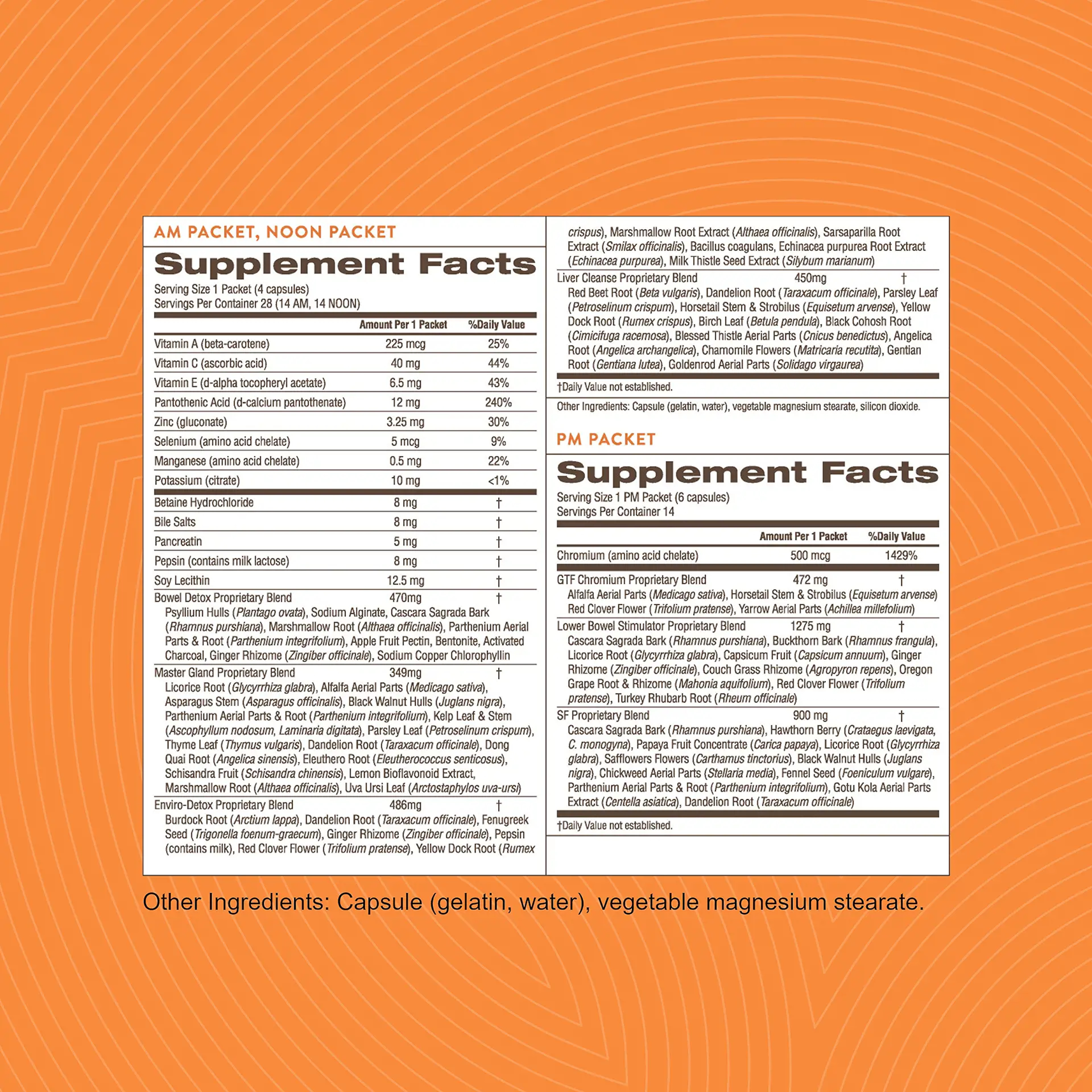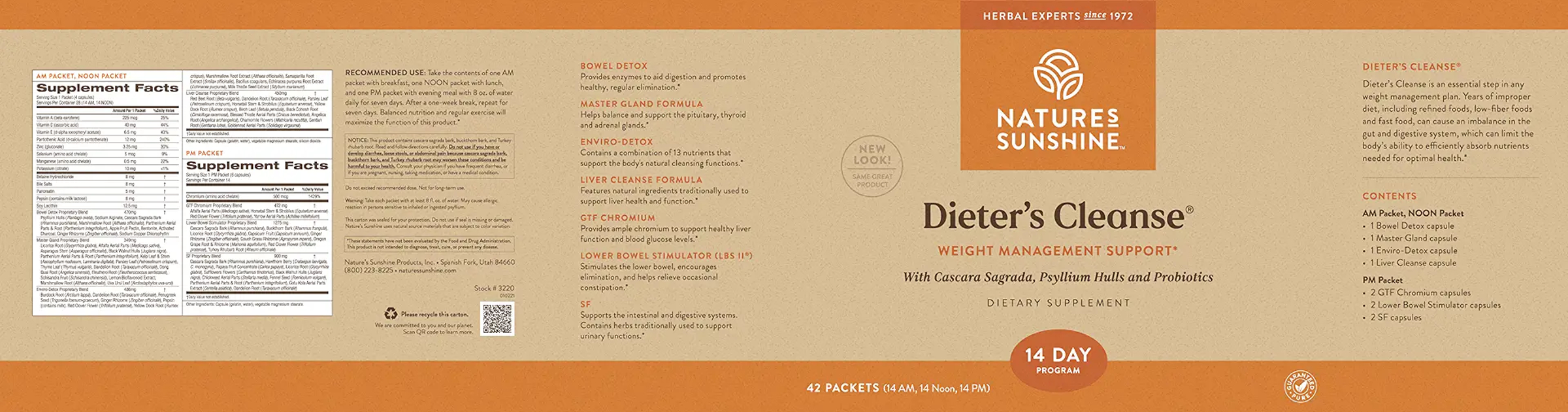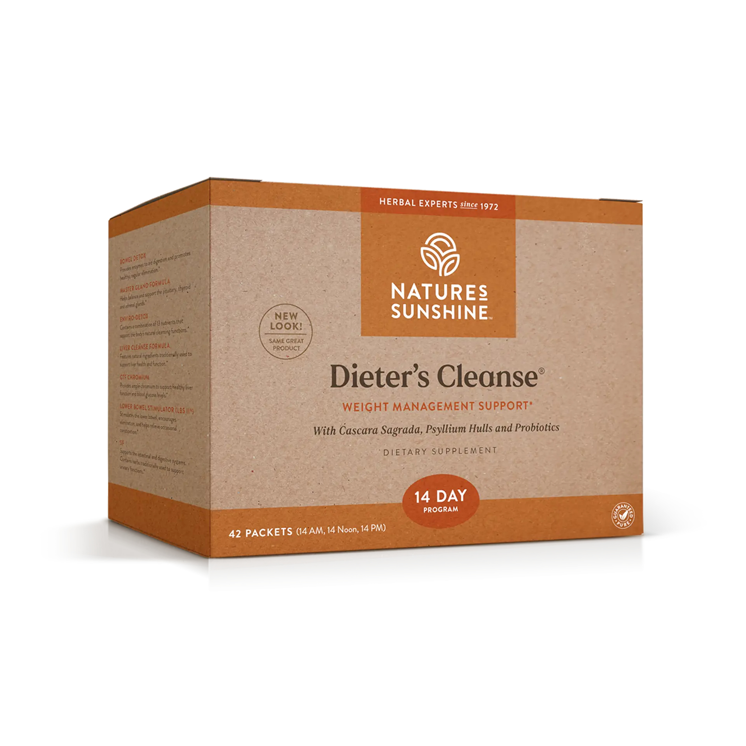 Each box of Dieter’s Cleanse® contains 14 AM packets, 14 NOON packets and 14 PM packets. The following NSP products are elements of Dieter’s Cleanse®:Bowel Detox (1 capsule in AM and NOON packets), Master Gland (1 capsule in AM and NOON packets), Enviro-Detox (1 capsule in AM and NOON packets), Liver Cleanse Formula (1 capsule in AM and NOON packets), LBS II (3 capsules in PM packet), SF (2 capsules in PM packet) and Chromium (1 capsule in PM packet).