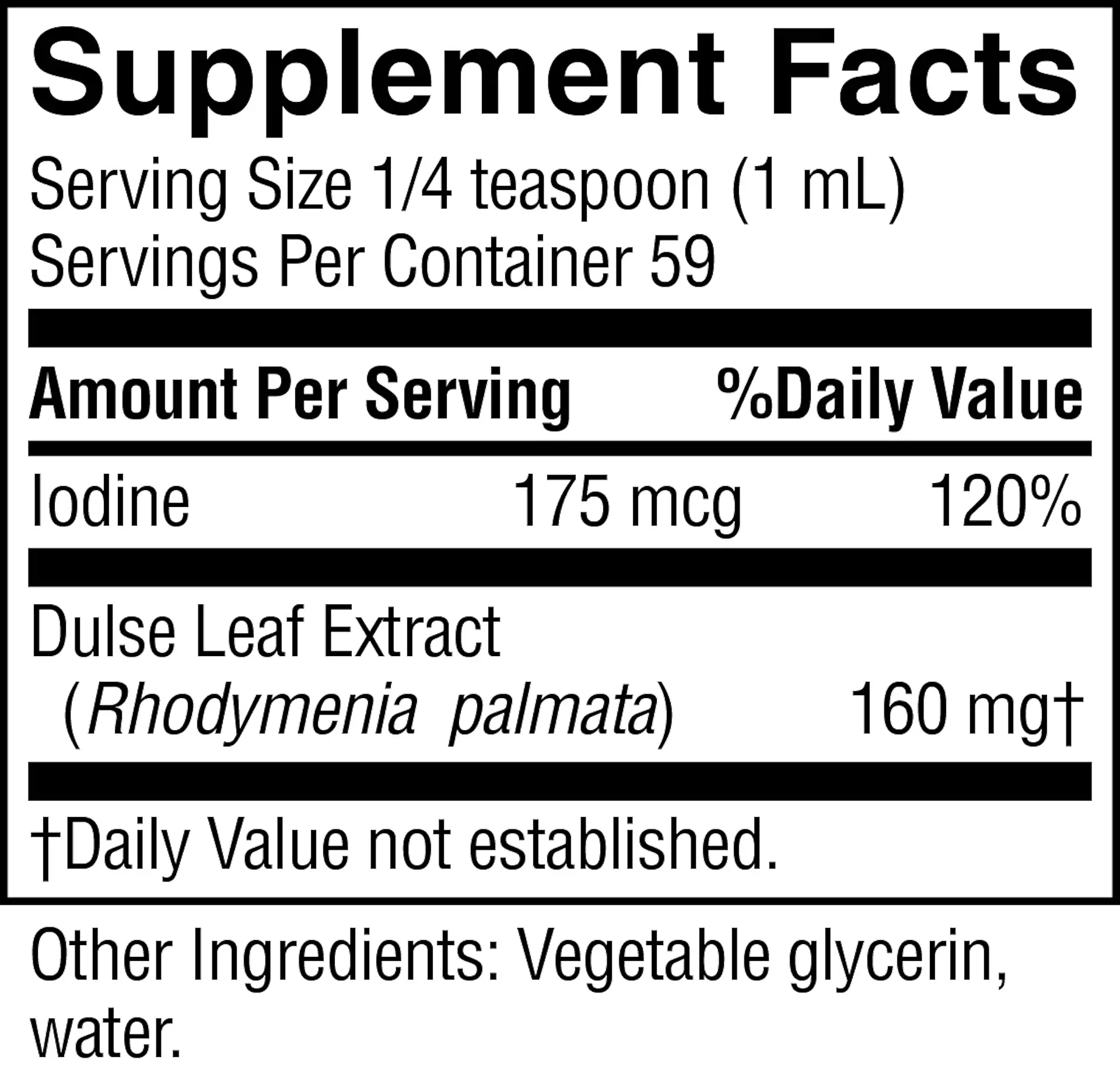 175 mcg iodine, dulse leaf extract, vegetable glycerin and water