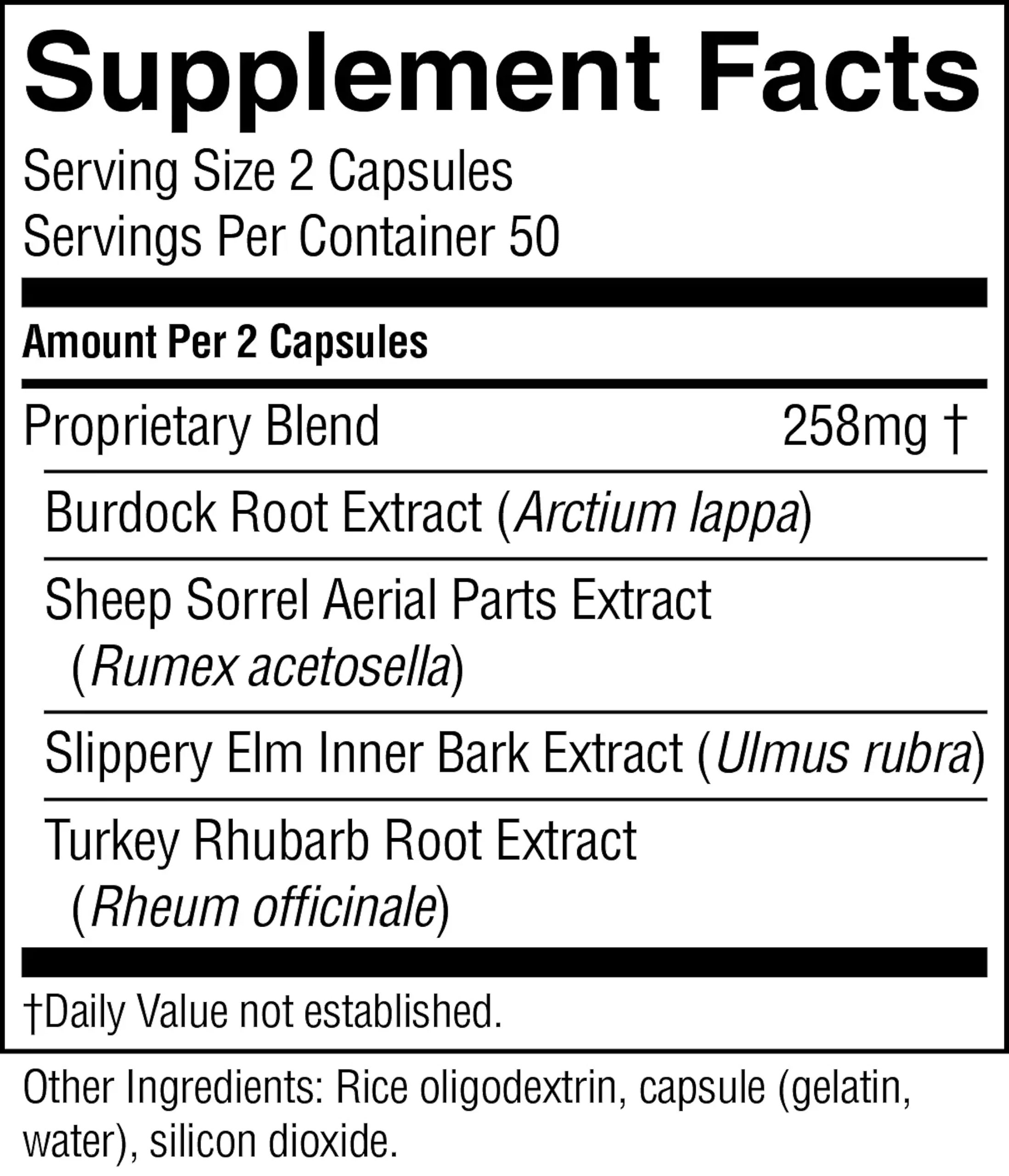 Extract of burdock root, sheep sorrel aerial parts, slippery elm bark and Turkey rhubarb root.