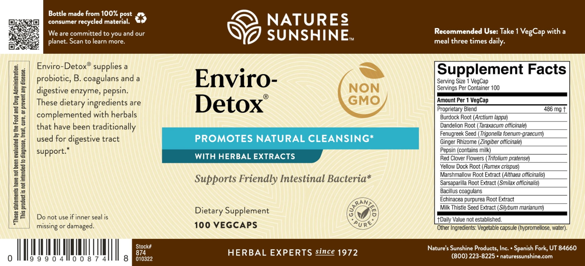 Pollutants and toxins are everywhere the air you breathe, the water you drink, the food you eat and the soil its grown in. And they build up in the body. Escort them out with Enviro-Detox This awesome blend includes sustainably sourced, non-GMO herbs like burdock, red clover and milk thistle that have been used traditionally for detoxification. Plus B. coagulans to replenish friendly flora, and pepsin for digestive help.