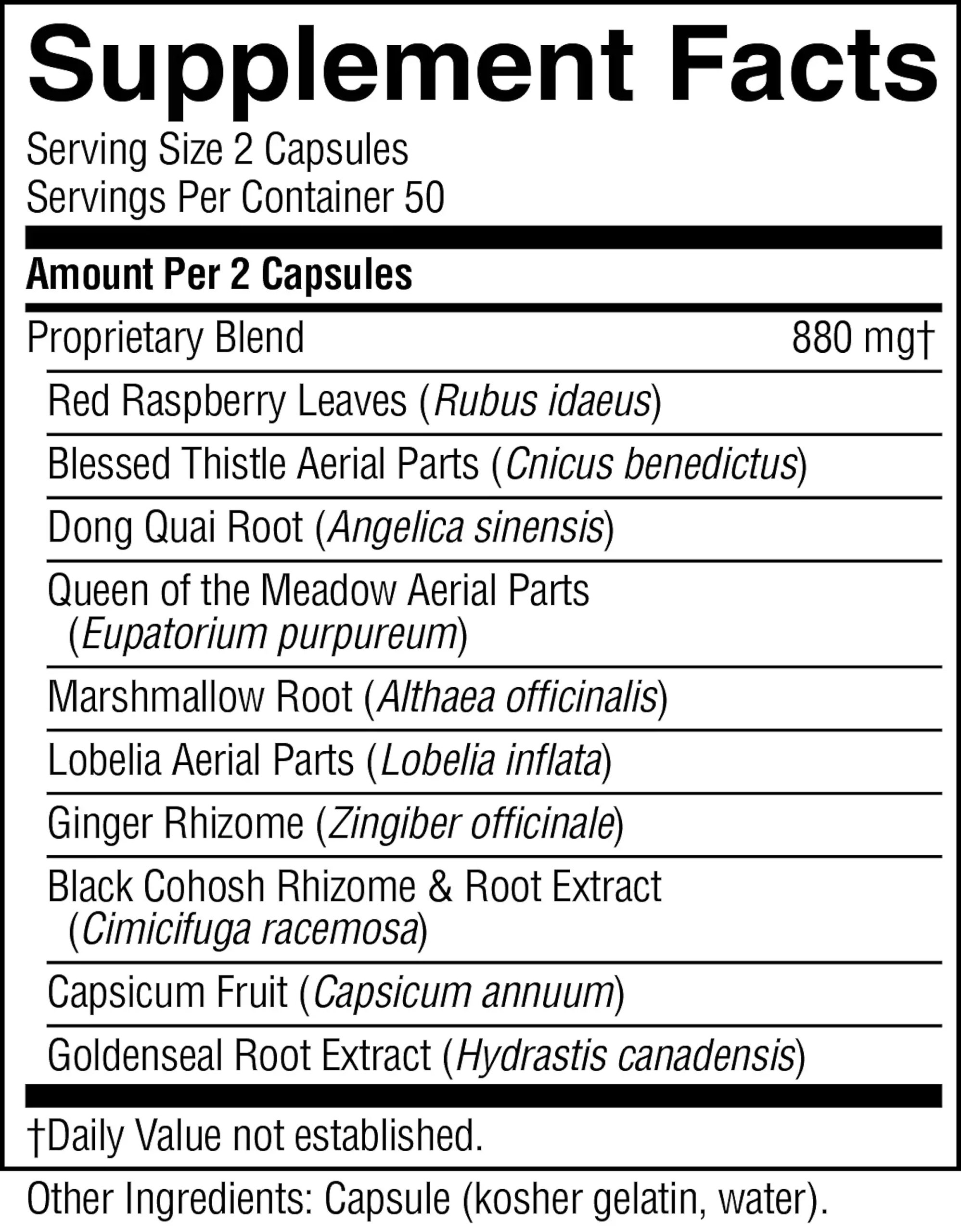 Red raspberry leaves, blessed thistle aerial parts, dong quai root, queen of the meadow leaf, marshmallow root, lobelia aerial parts, ginger rhizome, black cohosh rhizome and root extract, capsicum fruit and goldenseal root extract