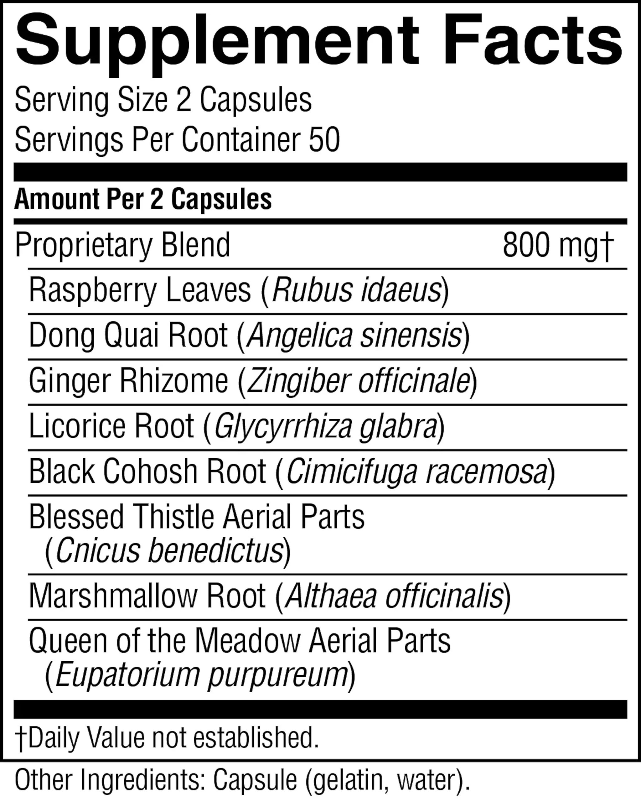 Raspberry leaves, dong quai root, ginger rhizome, licorice root, black cohosh root, blessed thistle aerial parts, marshmallow root and queen of the meadow leaves