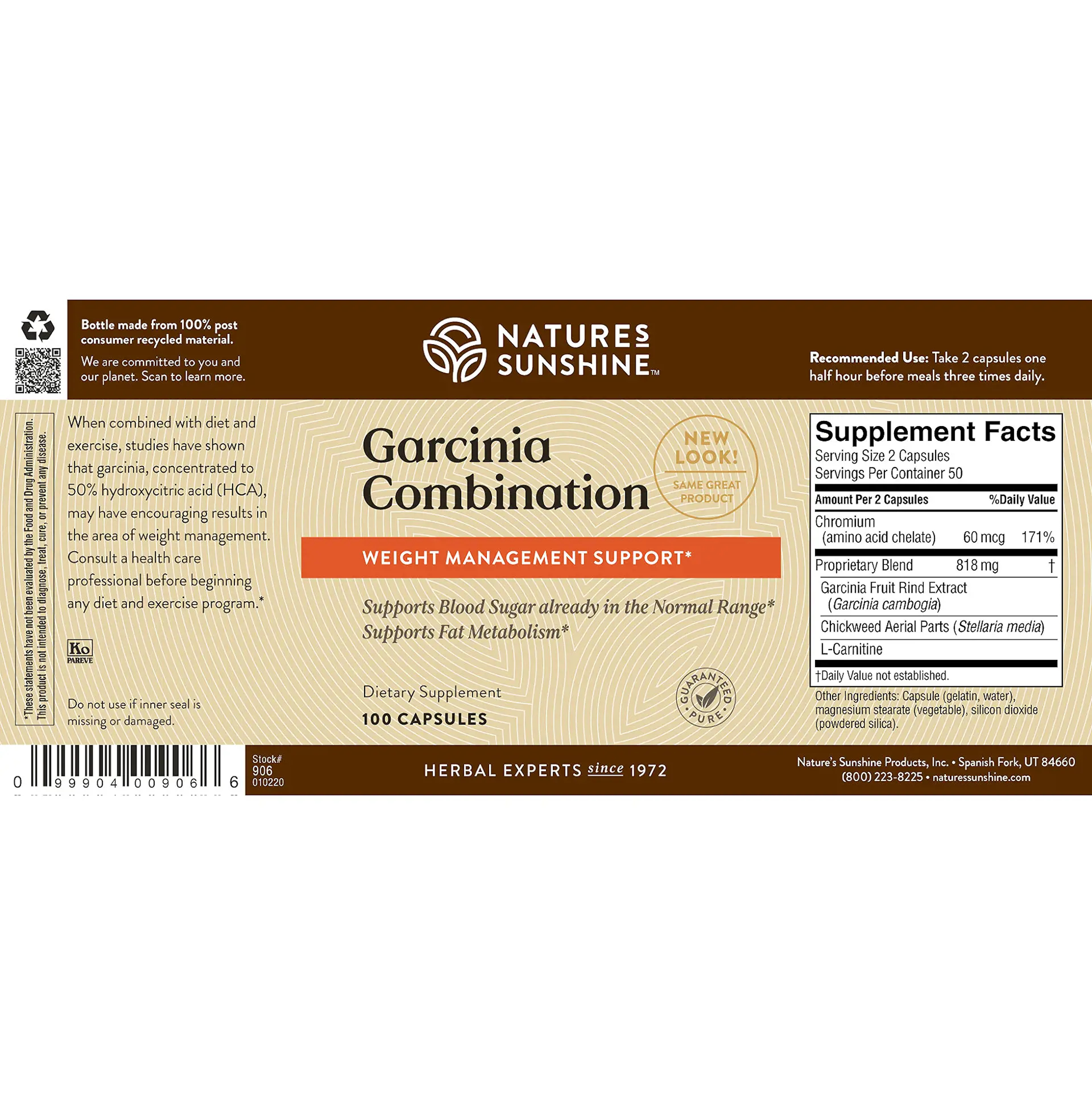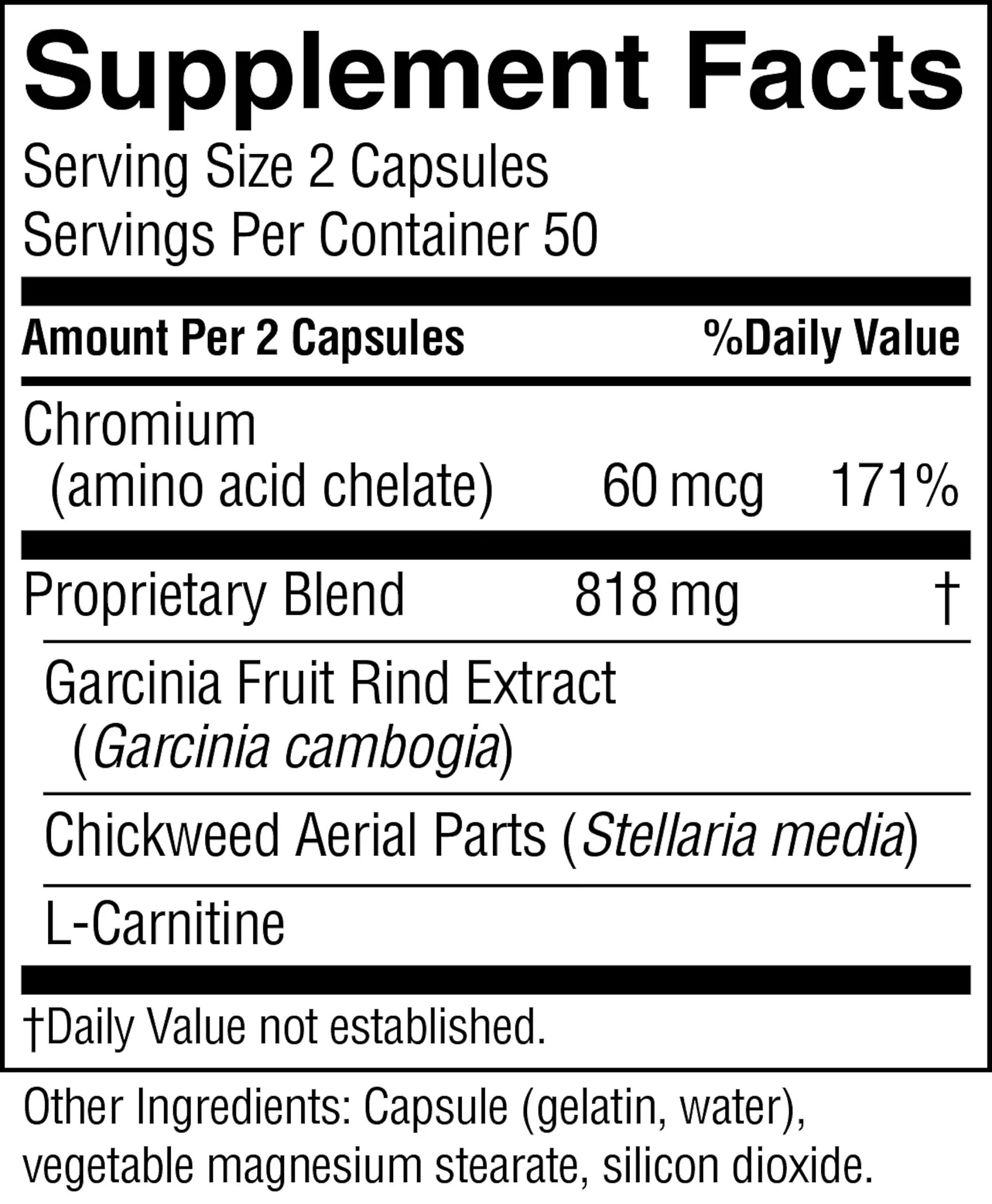 Garcinia fruit naturally contains hydroxycitric acid (HCA), which may influence fat metabolism. Studies have shown that garcinia concentrated to 50% HCA may have encouraging results in the area of weight management when combined with diet and exercise. Additionally in this formula, chickweed offers nutritional support for weight management, L-carnitine helps in the transport of long-chain fatty acids, and chromium (an essential trace mineral) plays a role in the regulation of normal-range blood sugar.