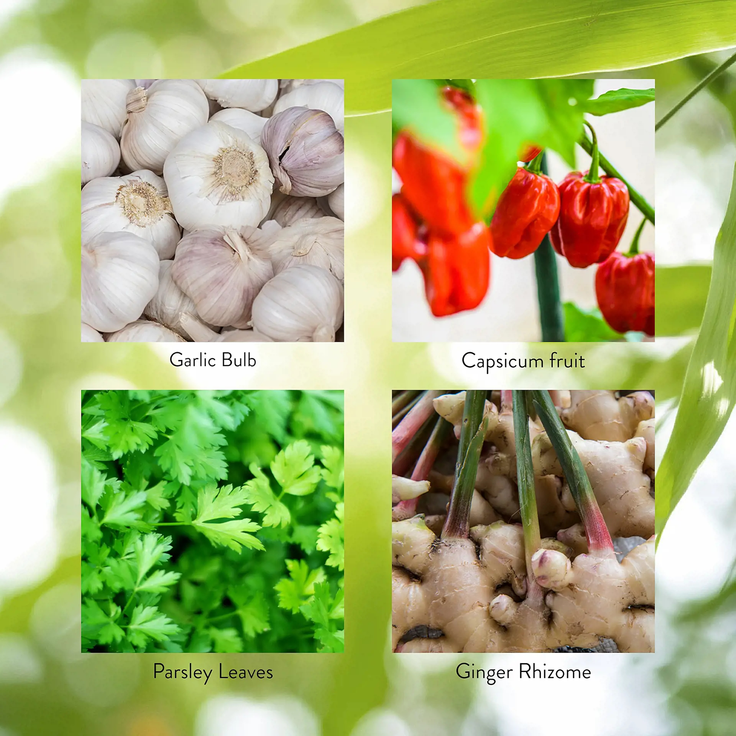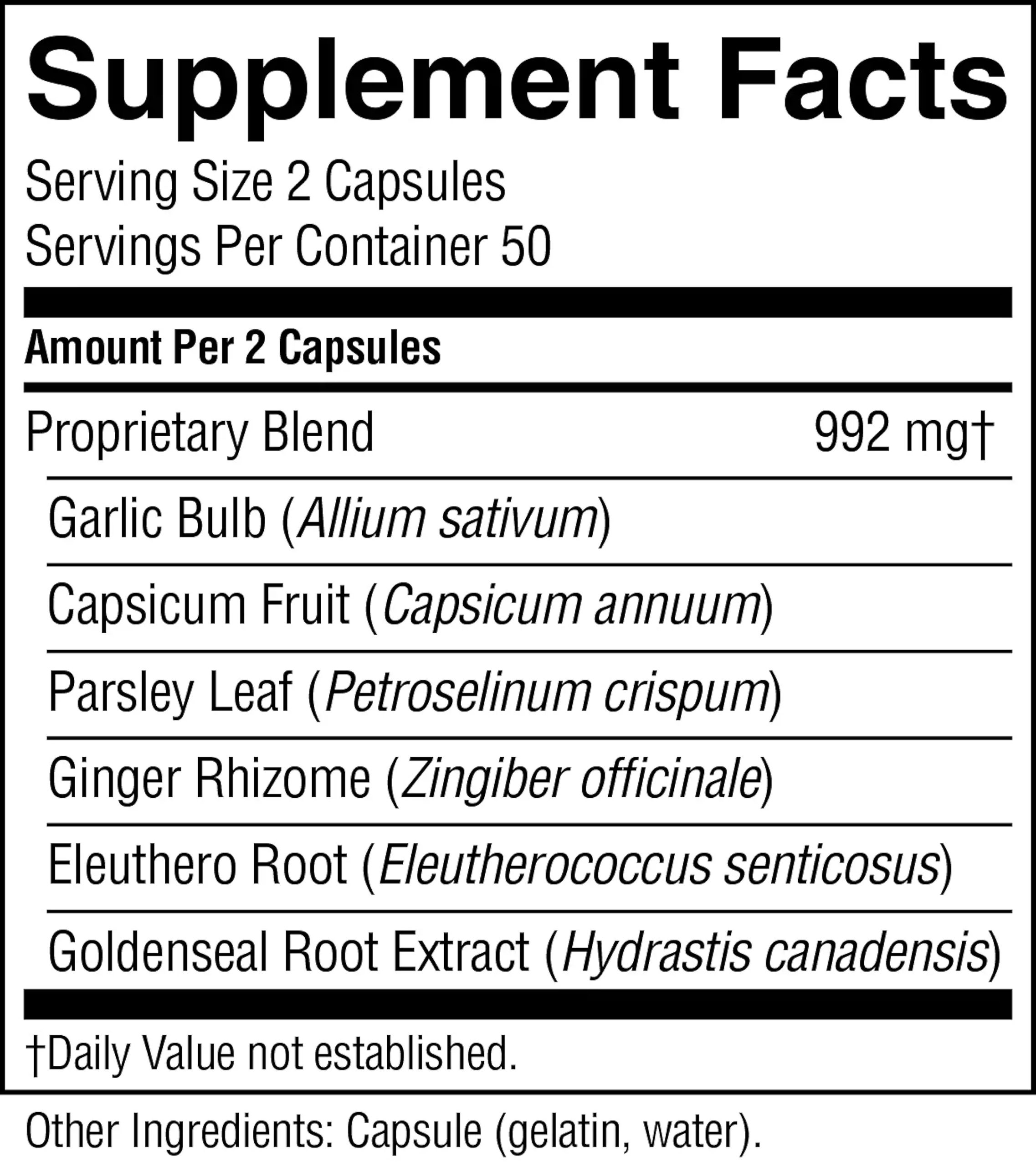 Garlic bulb, capsicum fruit, parsley leaves, ginger rhizome, goldenseal root and rhizome, and eleuthero root.