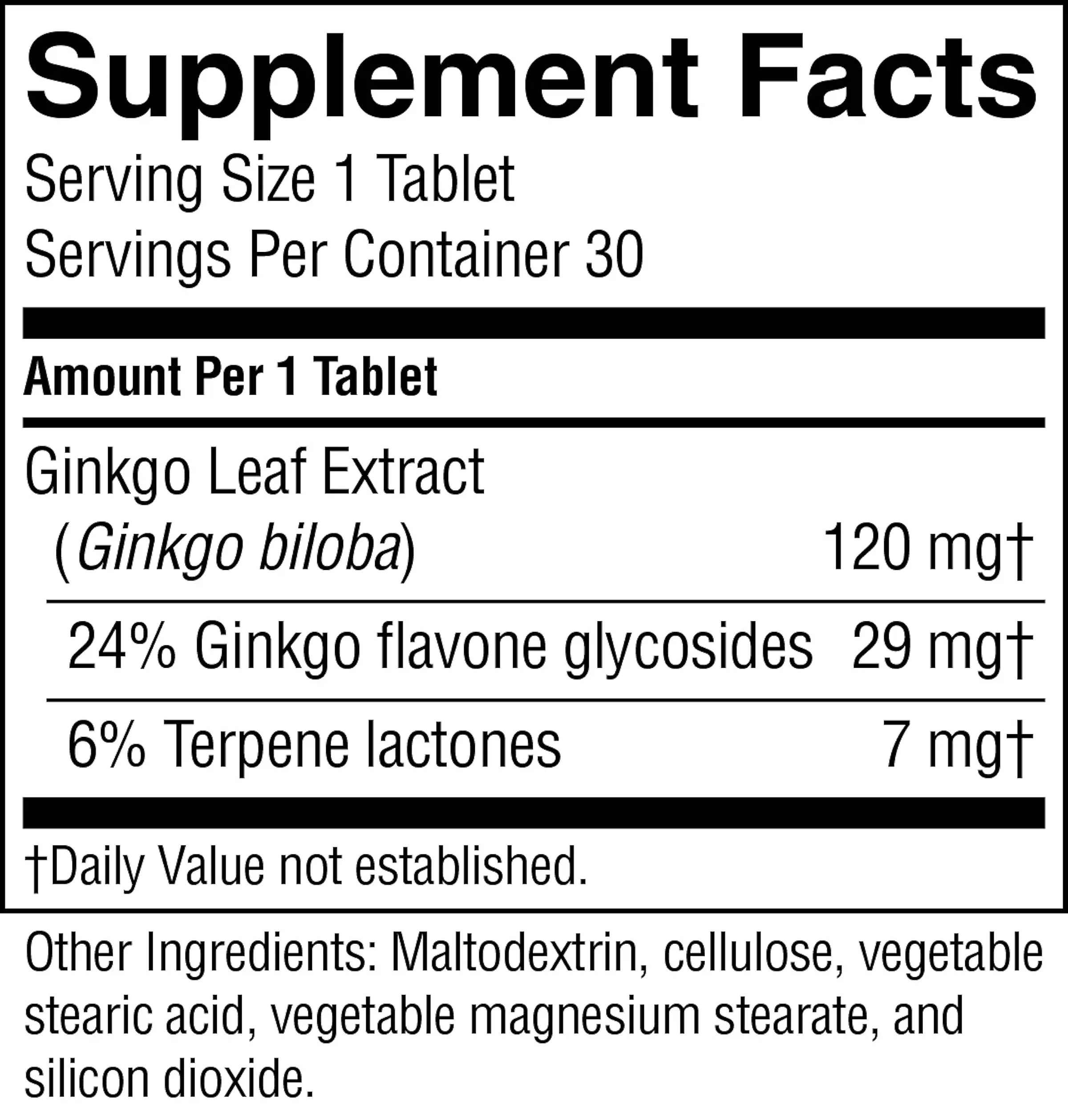Ginkgo is a powerful free-radical scavenger. It promotes circulation to the brain which improves brain function, memory and concentration. Each tablet is 120 mg concentrated ginkgo leaf extract standardized to ginkgo flavone glycosides and terpene lactones.