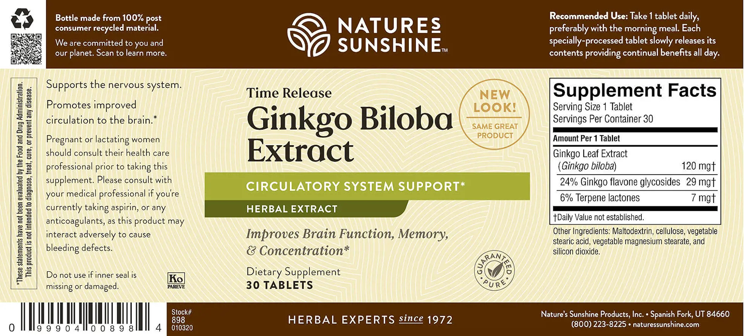 Memory trouble Think ginkgo One of the world’s oldest trees offers serious brain food. Our non-GMO Ginkgo biloba naturally promotes circulation to the brain and supports memory and concentration. Plus, our time-release format provides all-day benefits.