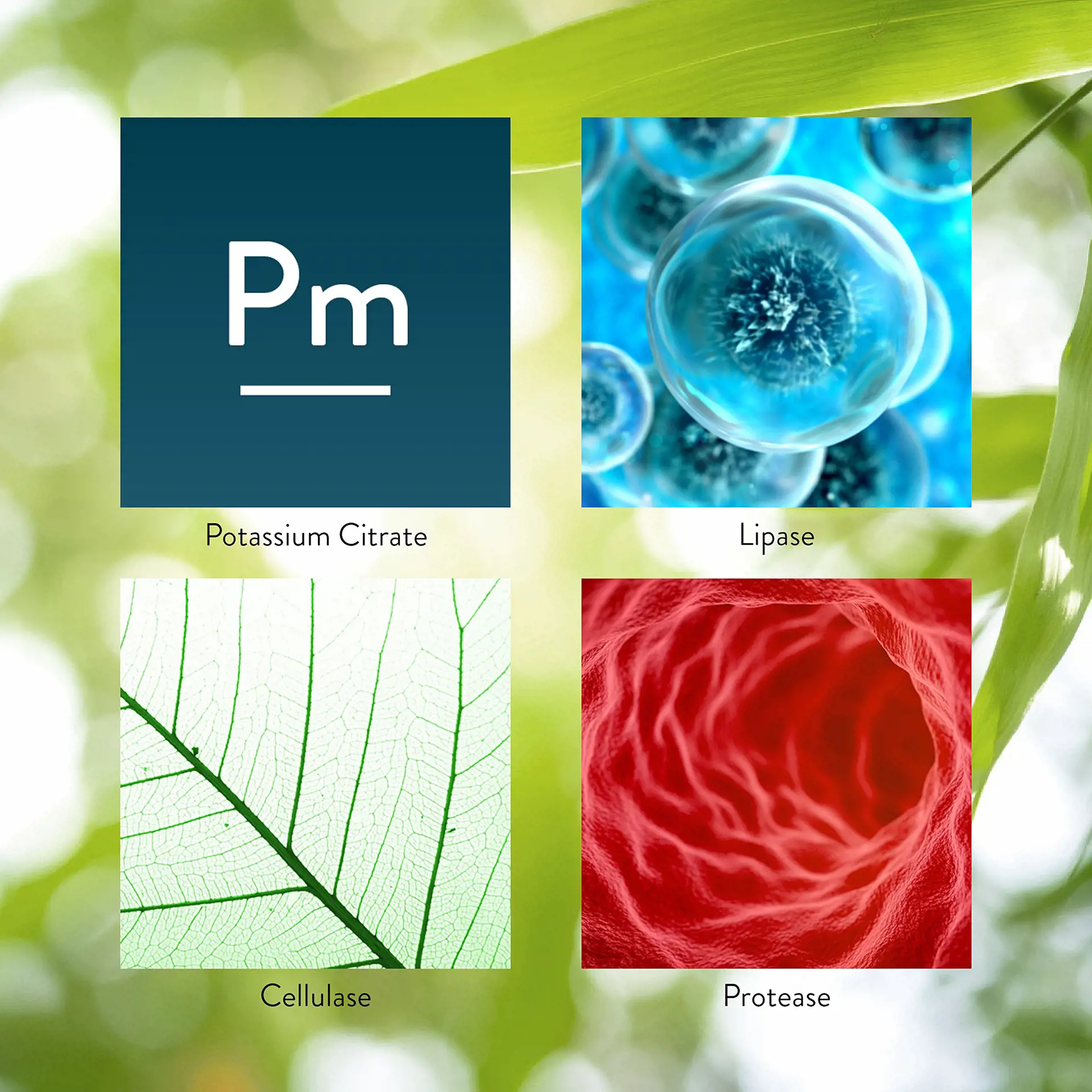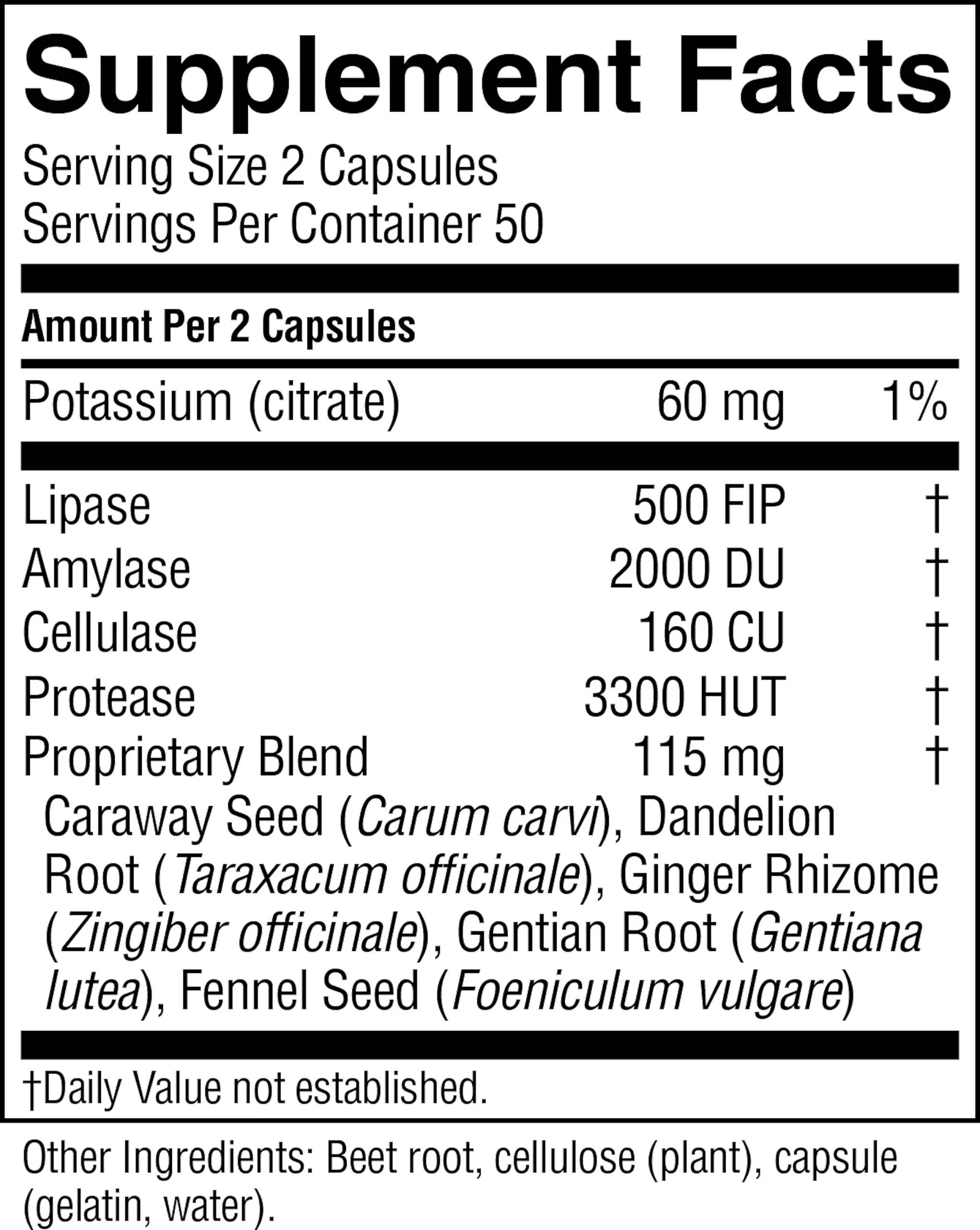 Potassium citrate, lipase, amylase, cellulase, protease, caraway seed, dandelion root, ginger rhizome, gentian root, fennel seed and red beet root fiber
