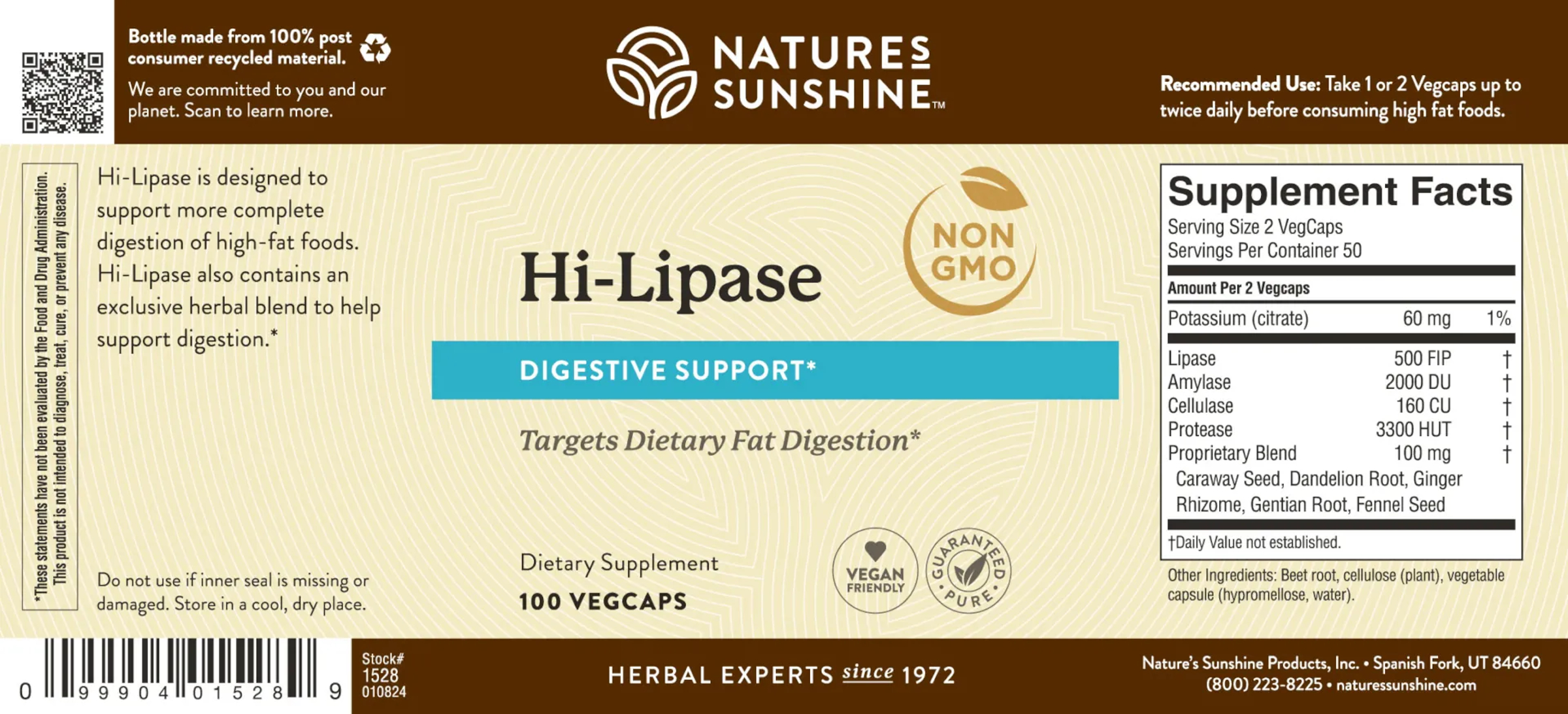 Bacon cheeseburger, fried chicken, hash browns. These foods sound de-lish to some, and like a giant stomachache to others. Hi-Lipase provides enzymes that break down fat in your food. It supports general digestion with other enzymes that digest starches and proteins. This blend features a complementary base of natural botanicals like caraway, ginger, gentian and other ethically sourced, digestion-supporting herbs.