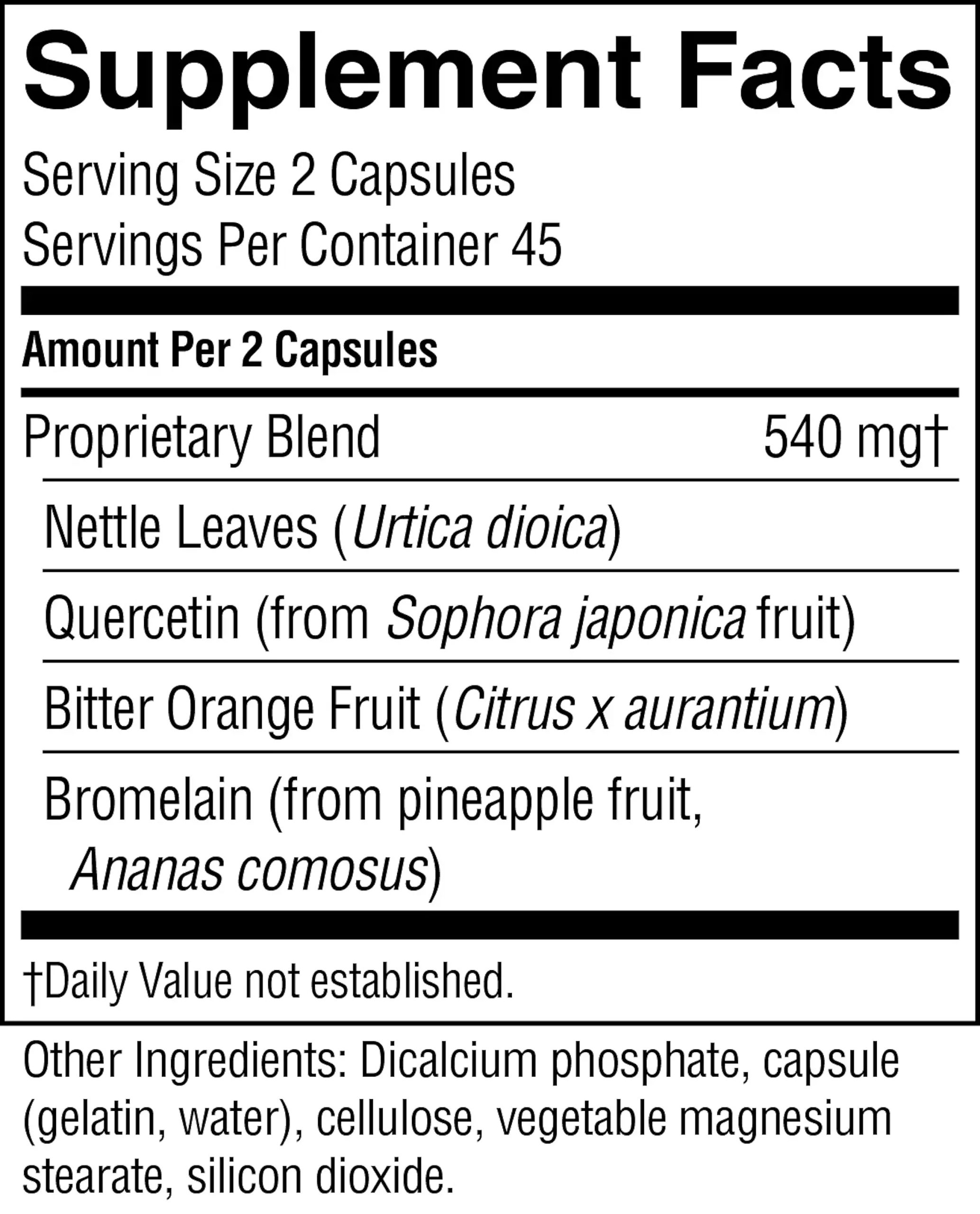 The whole is greater than the sum of its parts. Each ingredient strengthens this blend. Nettle has a long history of supporting respiratory health. Bitter orange adds other nutrients for helpful support. Quercetin fights free radicals and supports respiratory health. And bromelain helps maintain clear nasal passages.