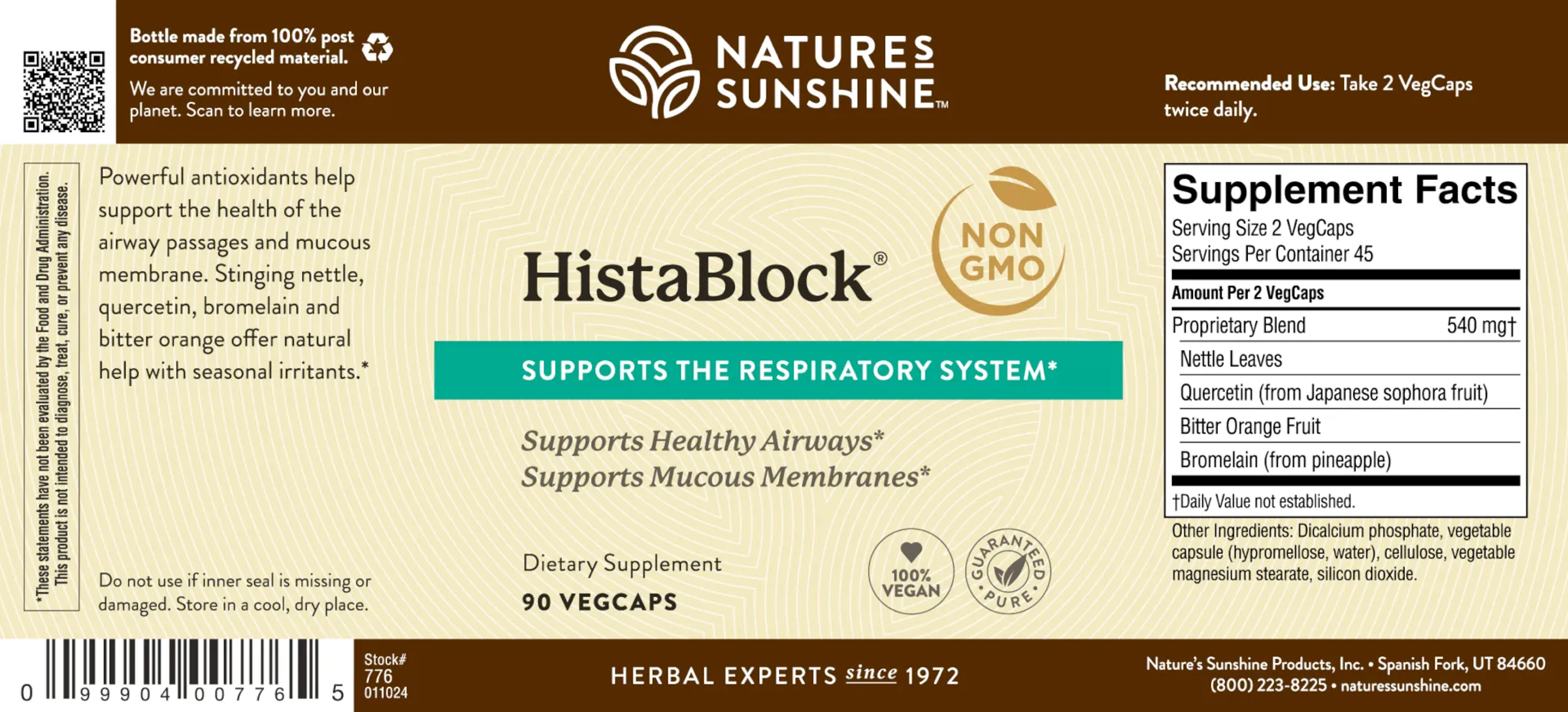 Don’t let seasonal irritants and pollutants interrupt your life . When pollen and dust start wreaking their havoc, try blocking them with HistaBlock Nature’s Sunshines’ unique herbal blend features stinging nettle, quercetin and bromelain to help you breathe easier .