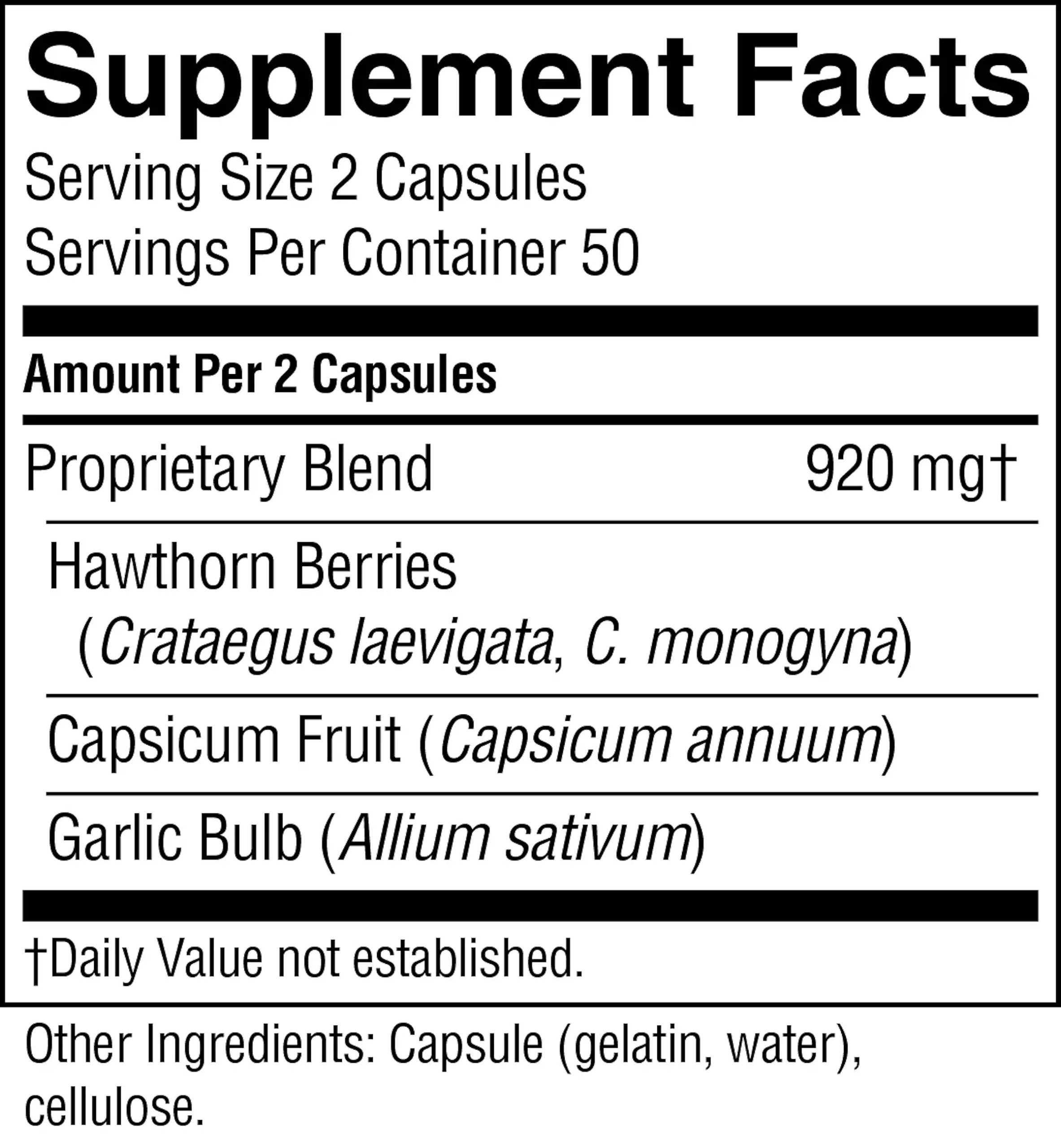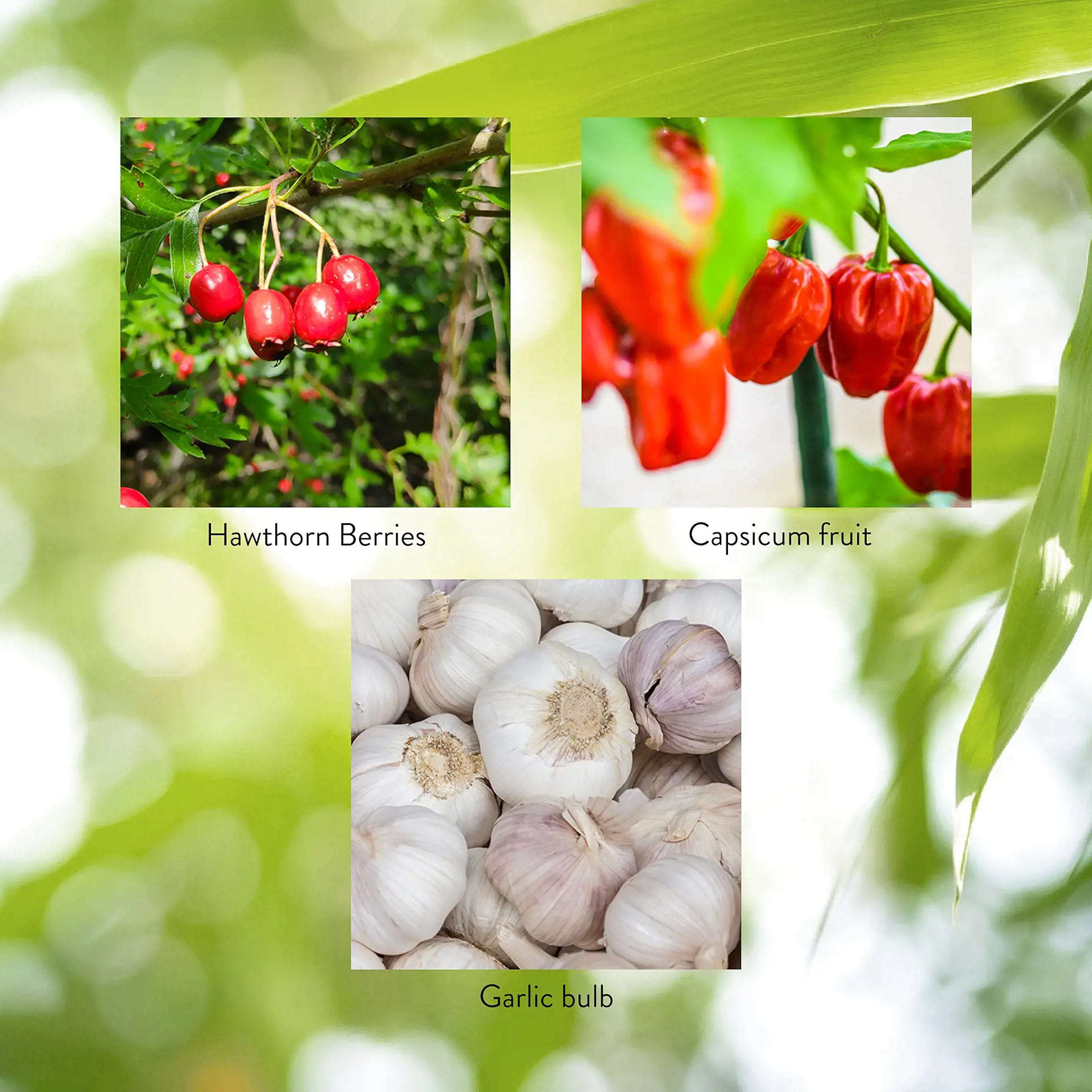 Hawthorn berries contain constituents that appear to enhance heart muscle function and circulatory health. Garlic may help to improve circulation. Capsicum may promote circulation in the extremities.