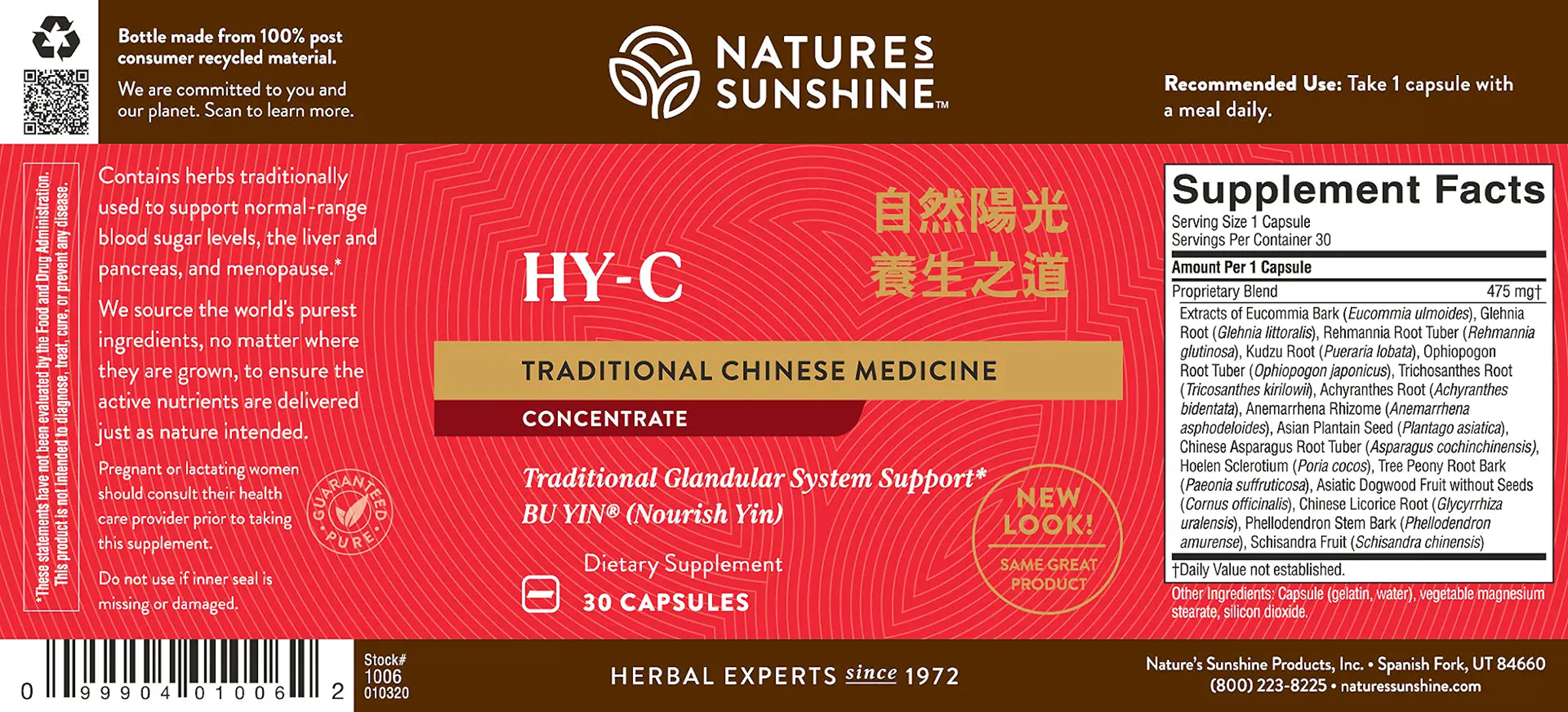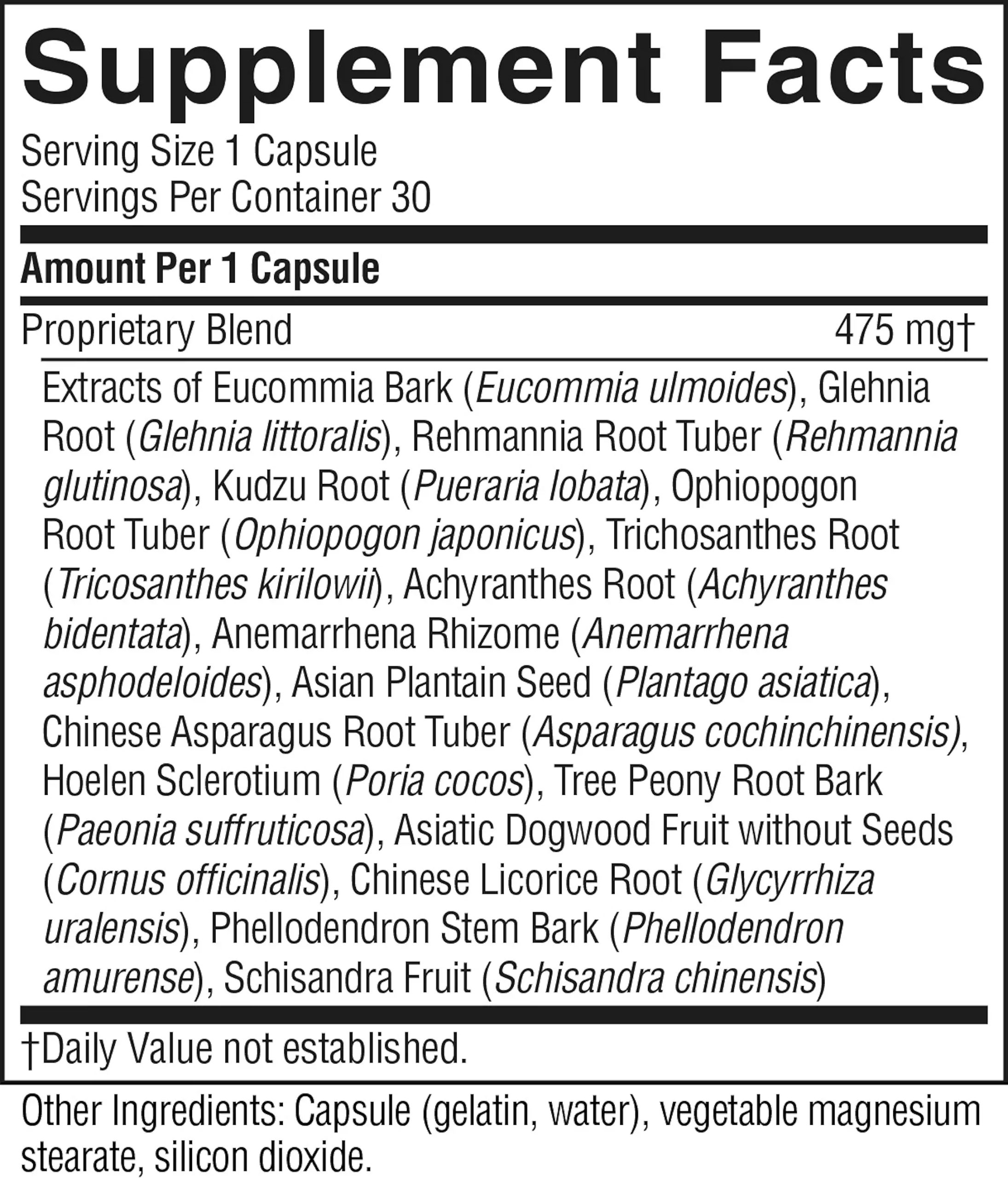 This formula contains the same herbs found in Chinese HY-C but in a highly concentrated blend. These herbs nutritionally support the glandular system and associated metabolic processes. According to Traditional Chinese Medicine, this formula is called bu yin, which means to “supplement yin.” In this case, yin is considered moisture. These herbs work to support the body as it attempts to reduce fire and strengthen water (support associated organs and maintain normal metabolic processes). Rehmannia root helps maintain blood sugar levels already in the normal range. Eucommia has been used to support the liver, kidneys and muscles and to strengthen the lungs. Eucommia is also believed to support cardiovascular function. Ophiopogon is used in Chinese herbology to support yin and lung function. The plant is said to be a moisturizer, moistening the lungs and intestines.
