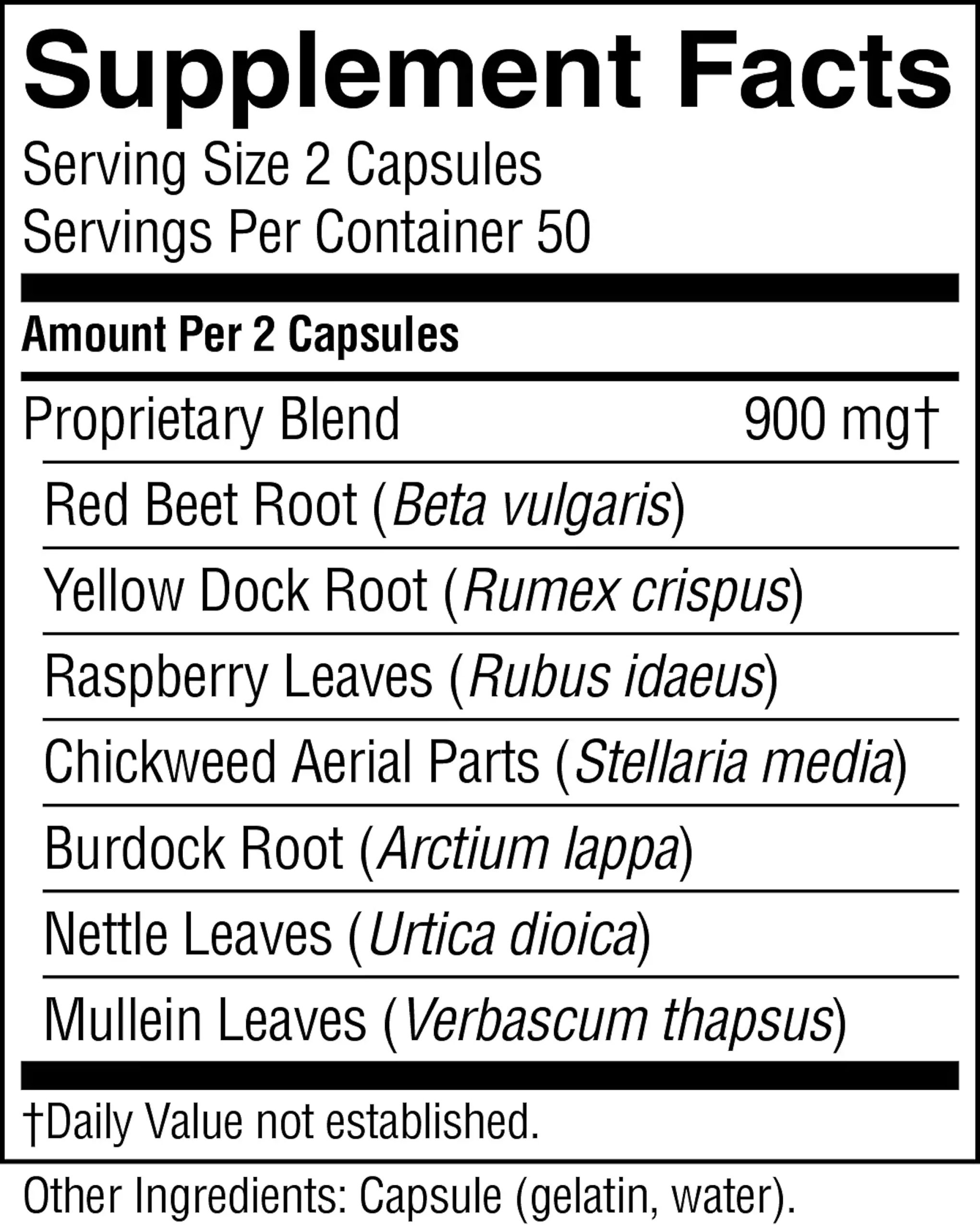 Red beet root, yellow dock root, red raspberry leaves, chickweed aerial parts, burdock root, nettle leaves and mullein leaves