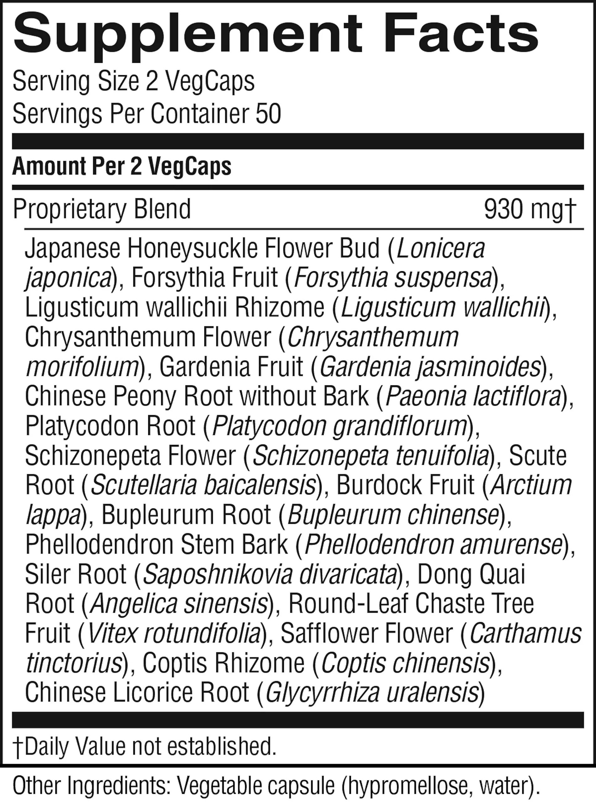 Lonicera flower bud, forsythia fruit, cnidium rhizome, chrysanthemum flowers, gardenia fruit peony root without bark, platycodon root, schizonepeta flower, scute root, arctium fruit, bupleurum root, phellodendron stem bark, siler root, tang-kuei root, vitex fruit, carthamus flowers, coptis rhizome and licorice root.