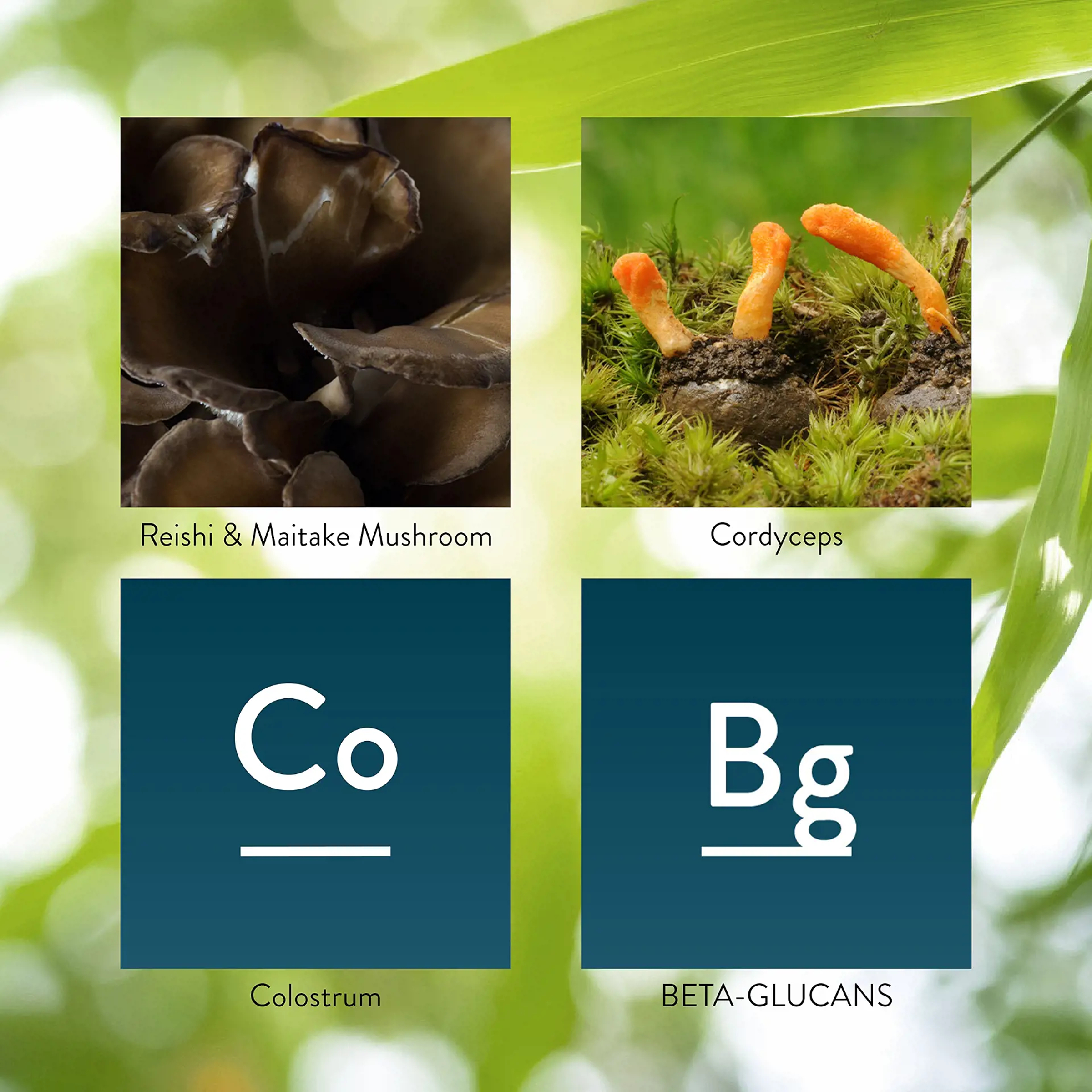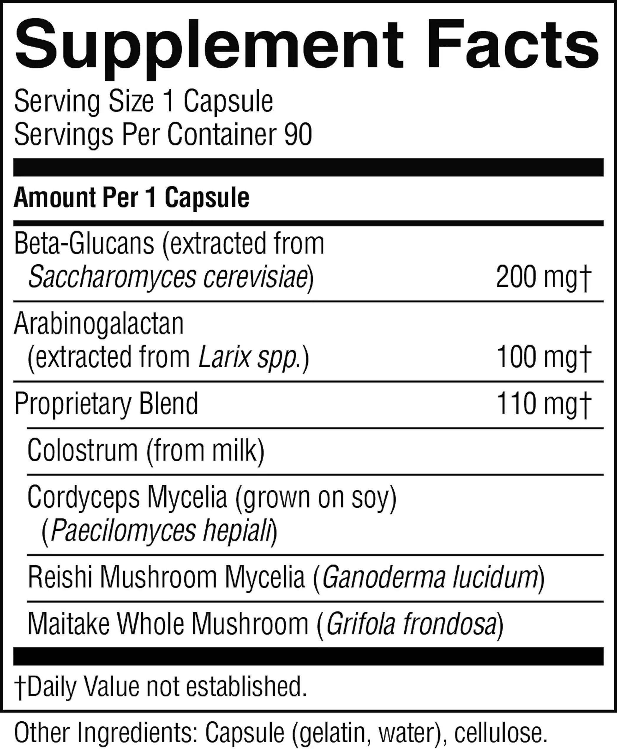 Beta-glucans, arabinogalactan, colostrum, cordyceps mycelia, reishi mushroom mycelia and maitake whole mushroom