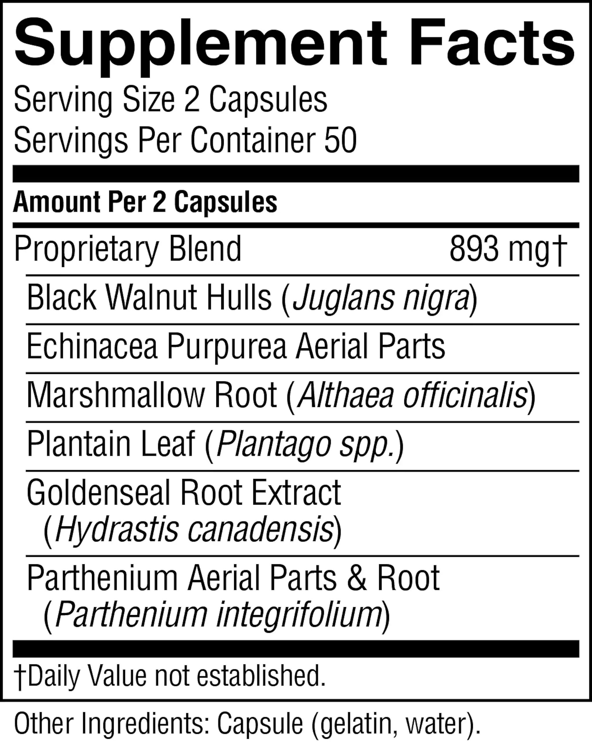 Black Walnut Hulls, Echinacea Purpurea Aerial Parts, Marshmallow Root, Plantain Leaf, Goldenseal Root Extract, Parthenium Aerial Parts & Root