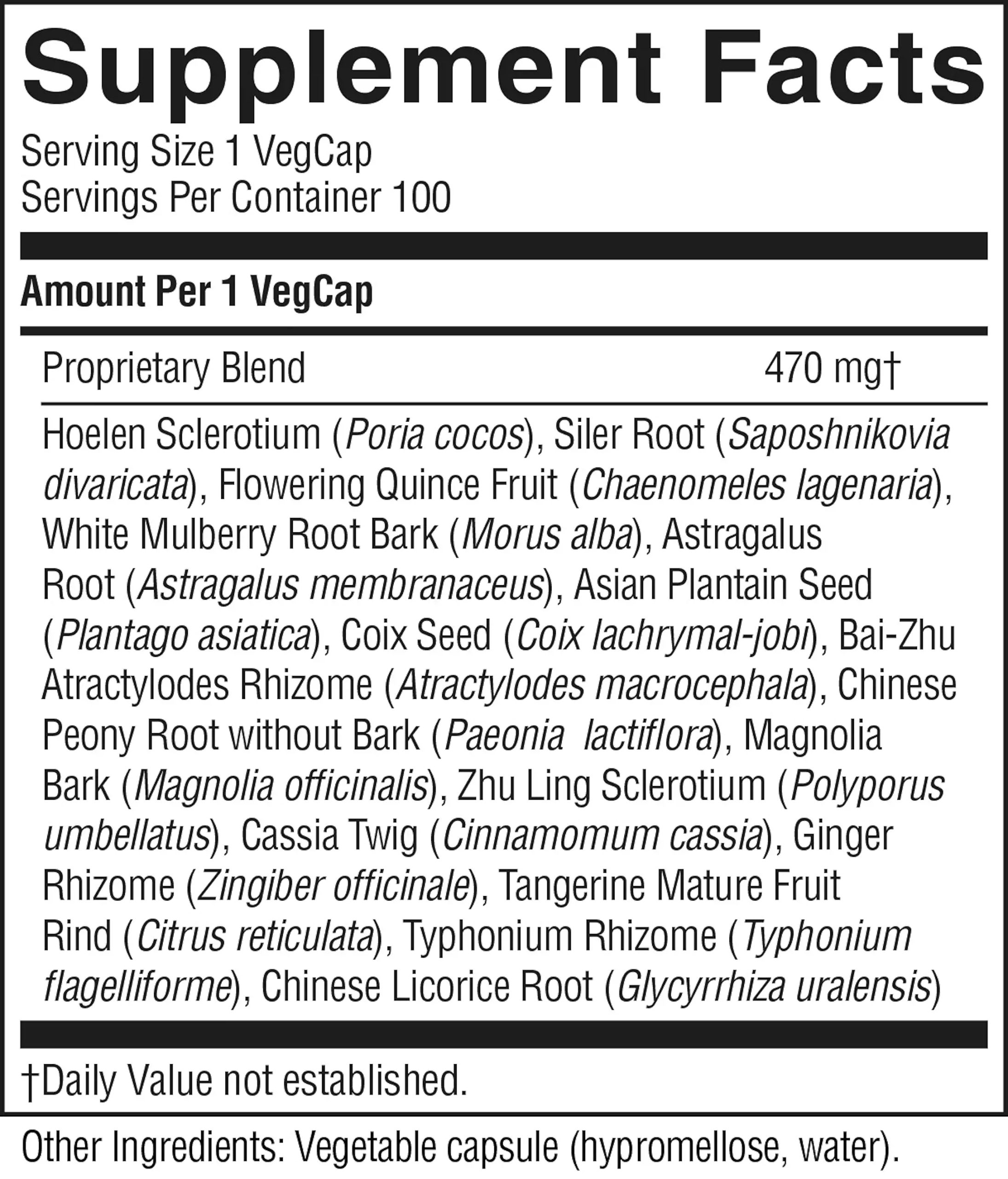 Hoelen sclerotium, siler root, chaenomeles fruit, morus root bark, astragalus root, alisma rhizome, plantago seed, peony root without bark, atractylodes rhizome, magnolia bark, polyporus sclerotium, citrus peel, cinnamon twig, ginger rhizome, typhonium rhizome and licorice root.