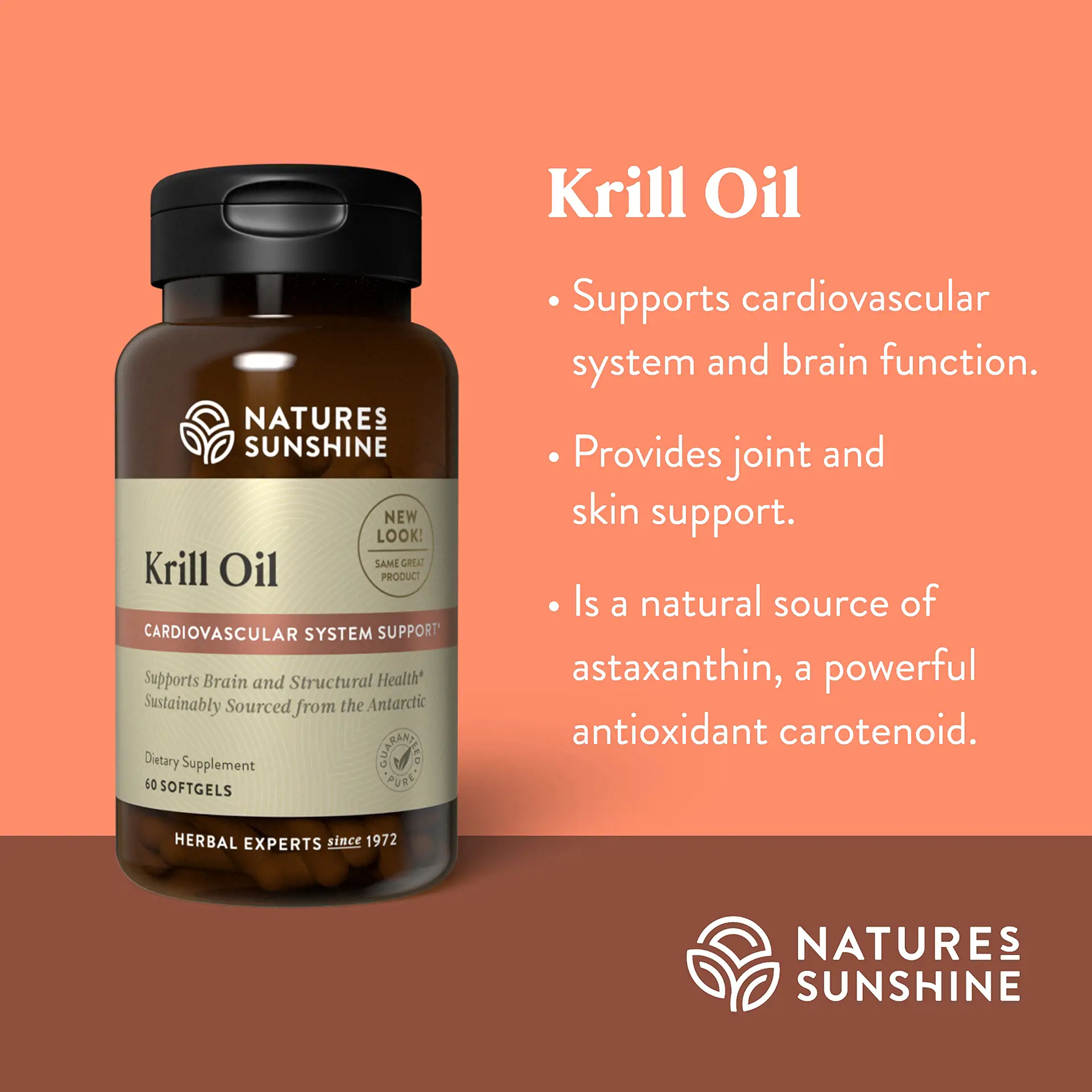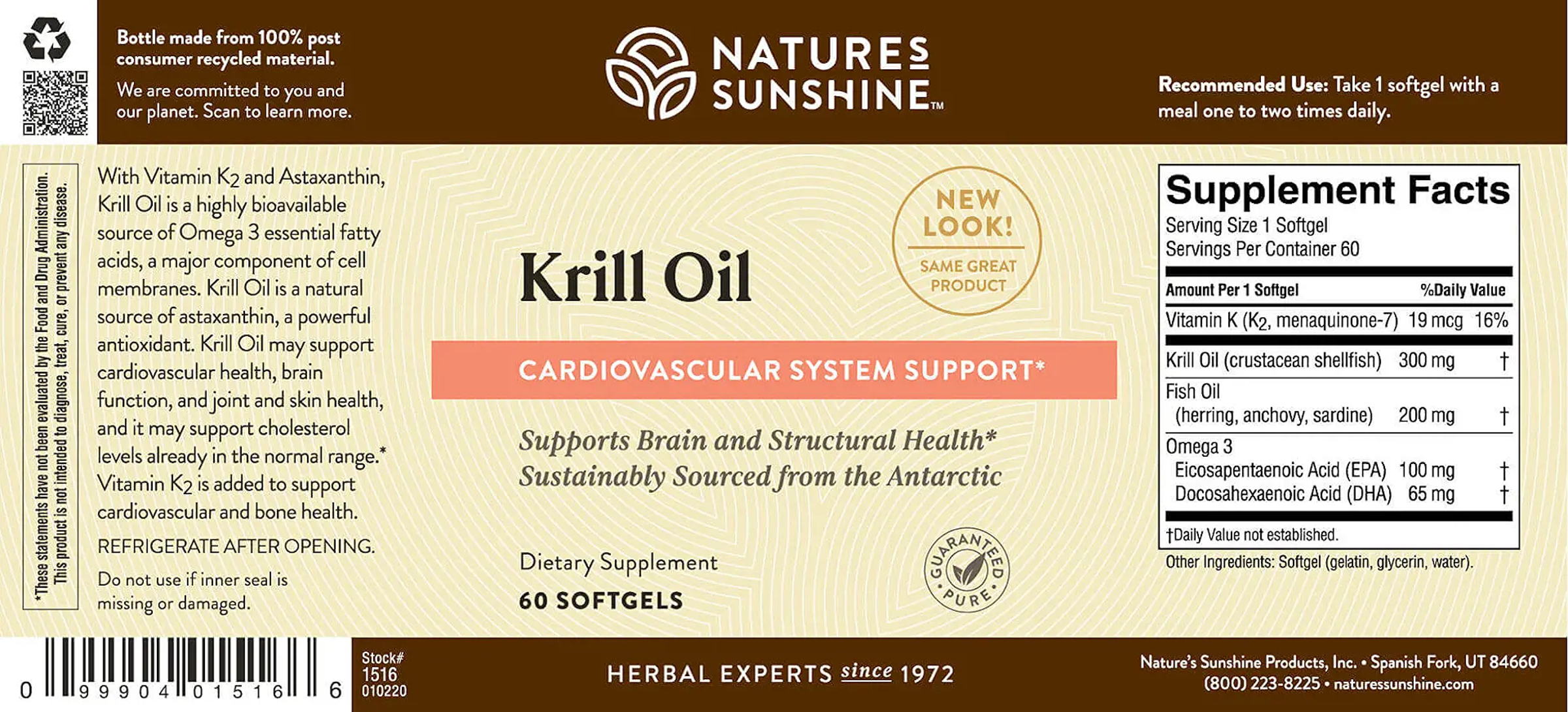 Antarctic Krill provides a highly bioavailable source of EPA and DHA, essential omega-3 fatty acids (EFAs). EFAs are vital to the health of the cell membrane and also contribute to cardiovascular, brain and structural system function. They provide joint and skin support and may help support cholesterol levels already within the normal range. Krill is also a natural source of astaxanthin, a powerful antioxidant carotenoid. Krill oil also contains phospholipids, which bind to the omega-3 fatty acids, improving their absorption in the body. These phospholipids provide strength and elasticity to the cell membrane, helping to keep toxins out and let nutrients and oxygen in. Vitamin K2 provides added support for the cardiovascular system and bone health.